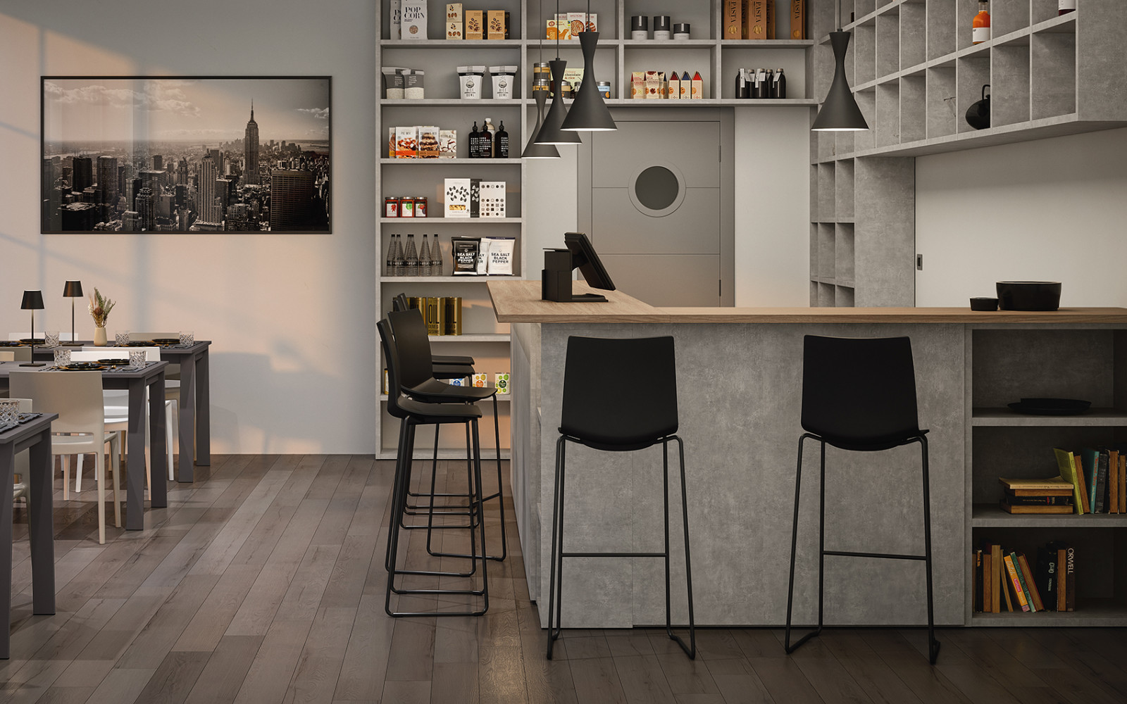 La boiserie decora y completa la composición: se puede equipar con repisas, colgantes y bases de suelo o suspendidas. Una solución ideal para caracterizar el espacio, gracias también a los distintos colores y acabados disponibles.