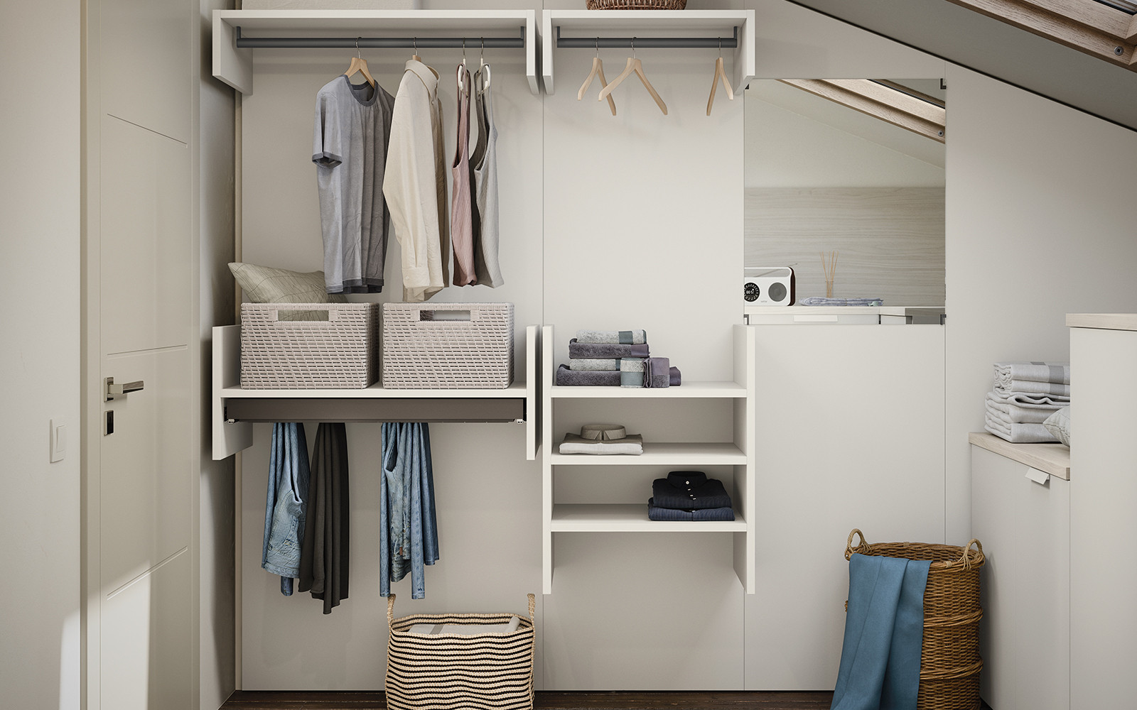Die Begehbaren Schränke zeichnen sich vor allem durch den modularen Aufbau ihrer Elemente aus. Sie passen sich leicht an ganz verschiedene Raumsituationen an und lassen sich auch für Mansardenlösungen in Dachschrägen verwenden. Egal ob Flügel-, Falt- oder Schiebetüren, entscheiden Sie sich für die Tür, die am besten zu Ihrer Planung passt.