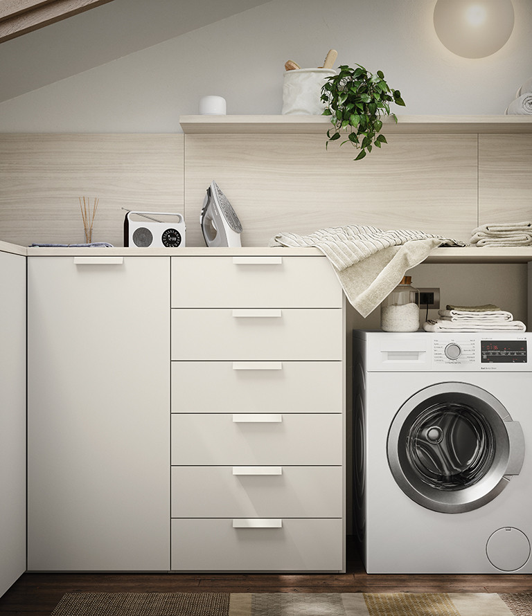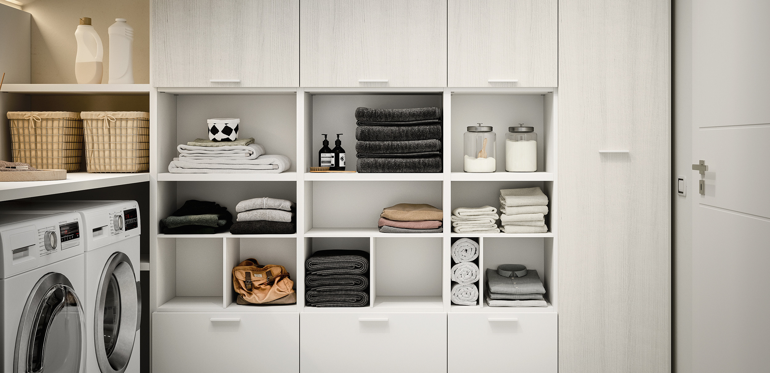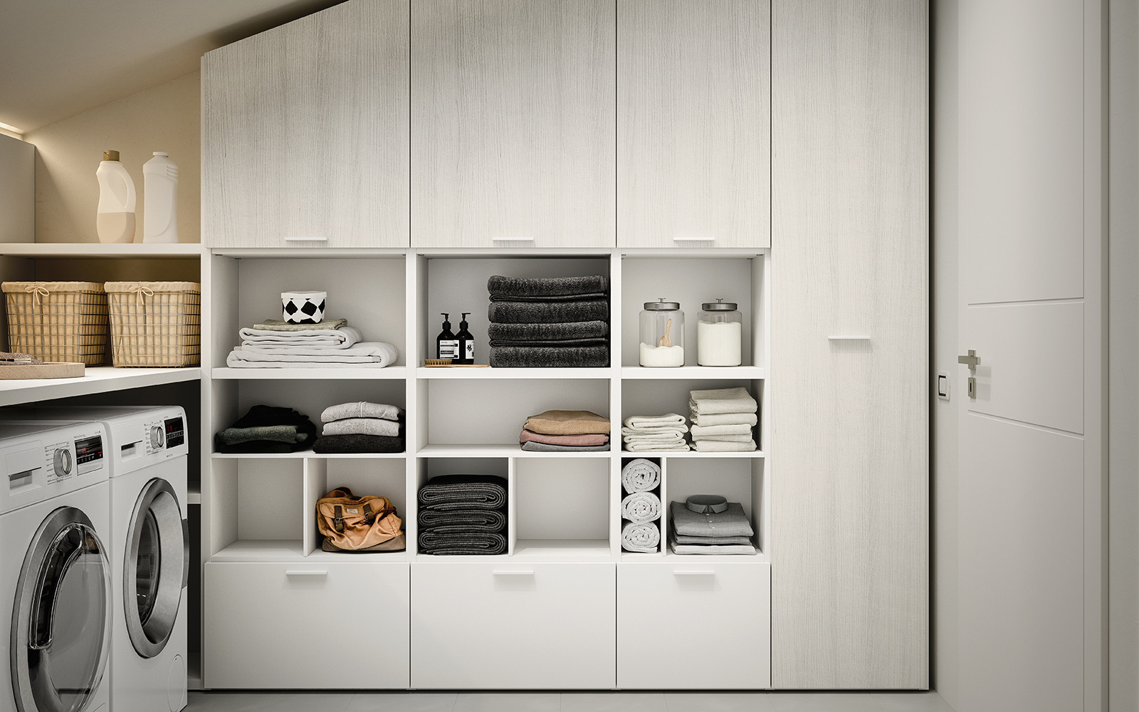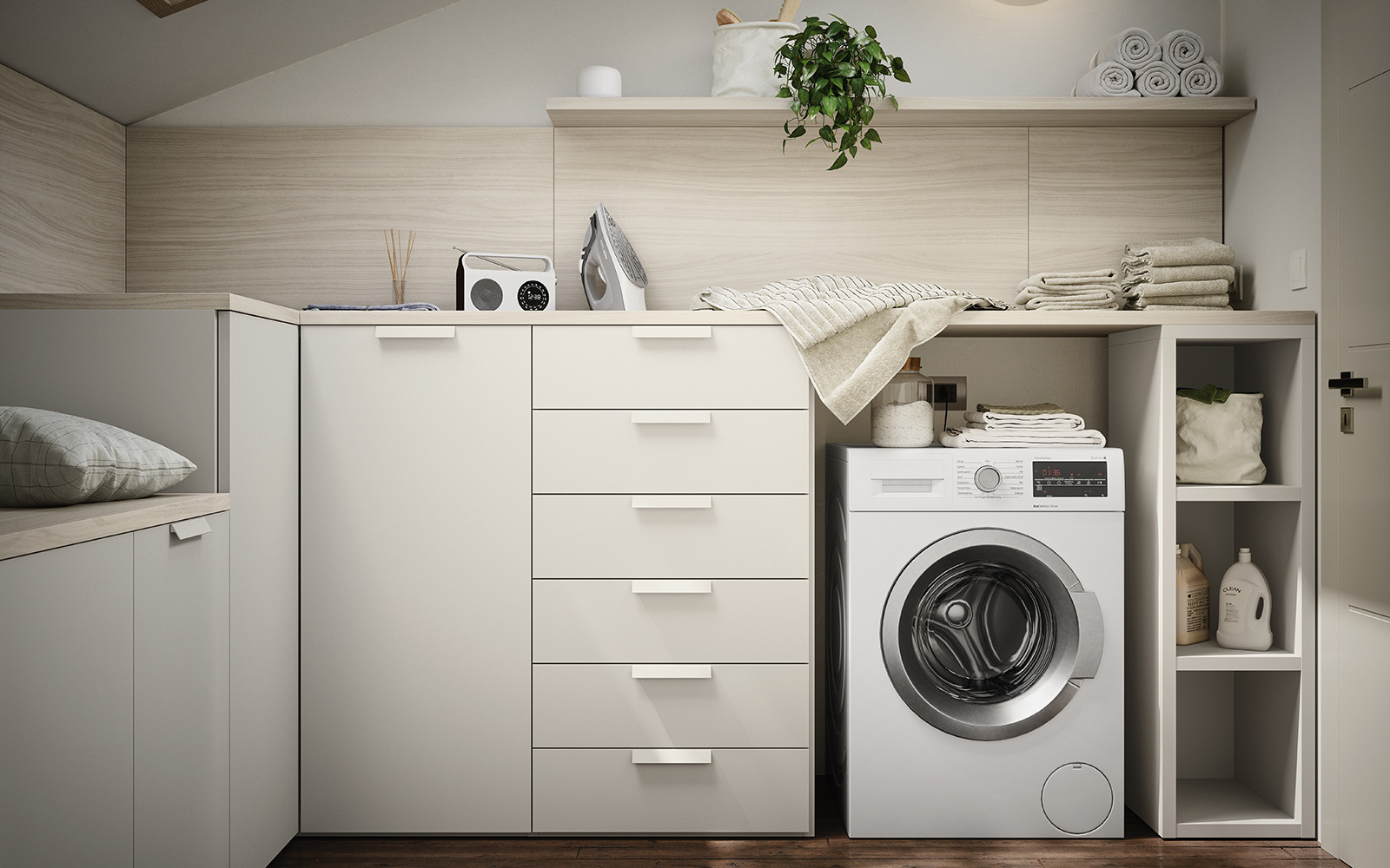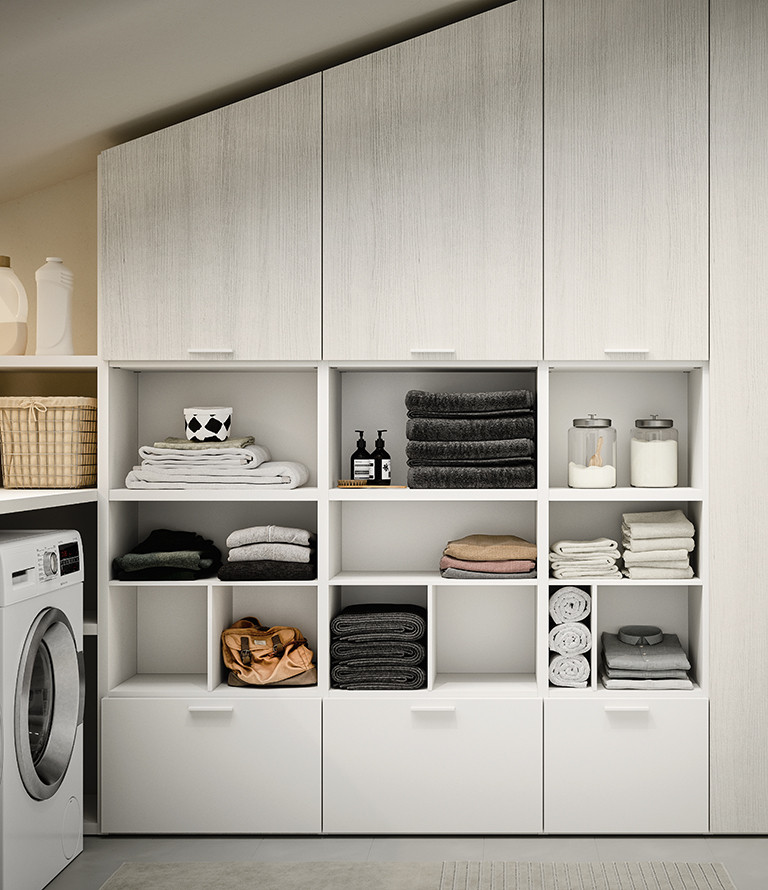 Die große Modularität der Elemente ermöglicht es, den verfügbaren Platz optimal zu organisieren, selbst in einem Raum mit Dachschrägen. Dank raumoptimierter Einrichtungslösungen lassen sich auch Hauswirtschafts- oder Abstellräume sinnvoll konzipieren und einrichten. Ein Wasch- und Hauswirtschaftsraum, bei dem der verfügbare Platz intelligent und funktional genutzt wird.