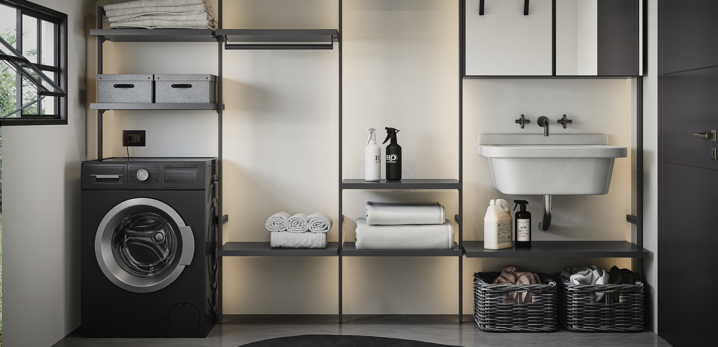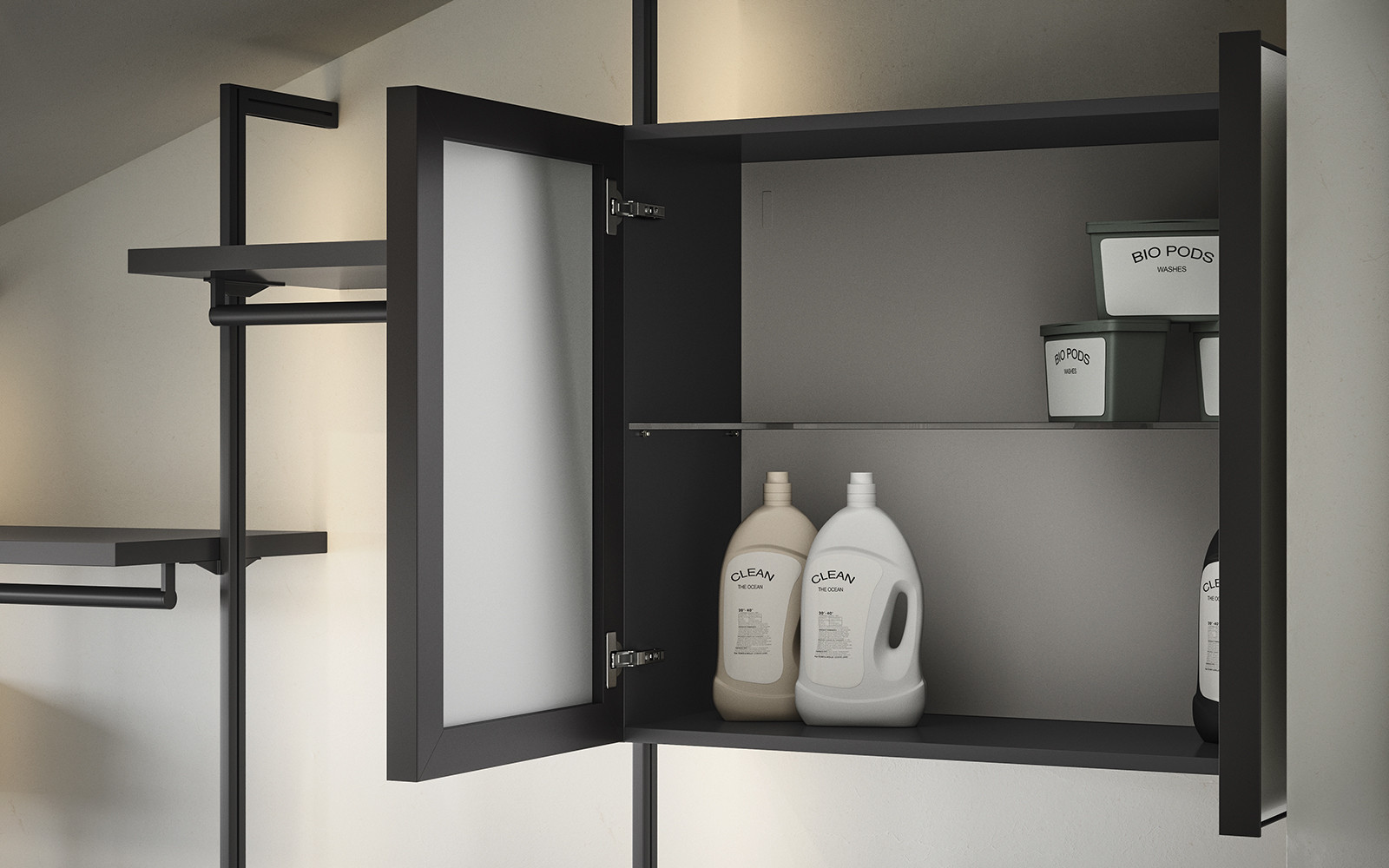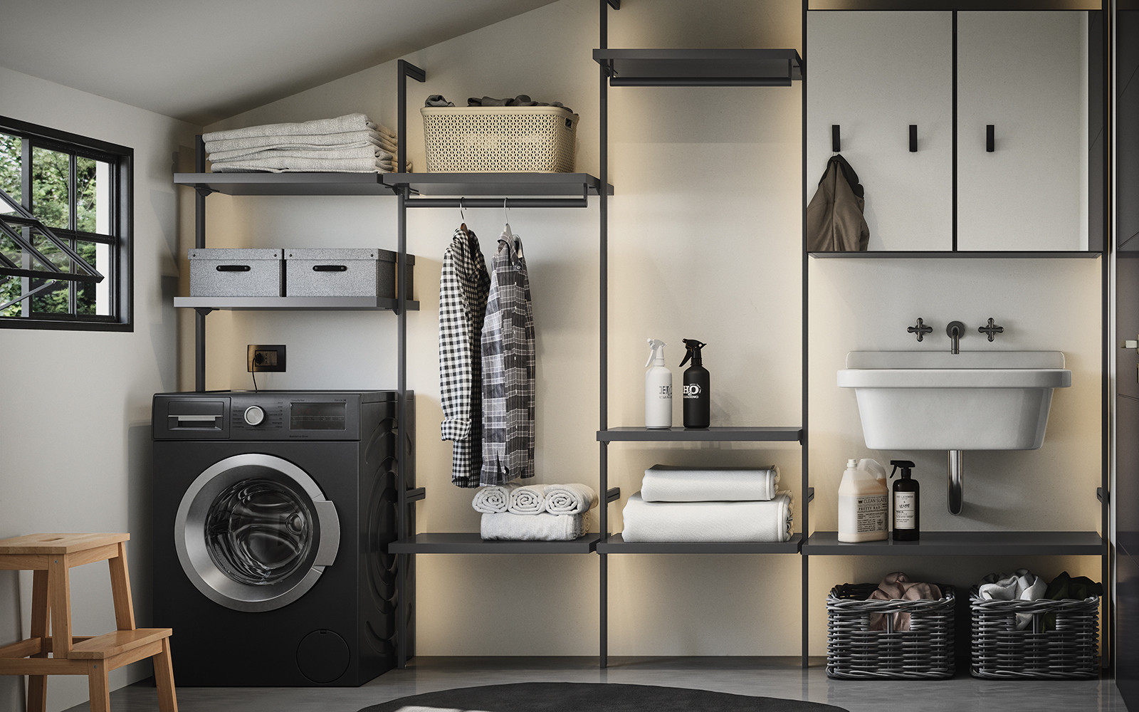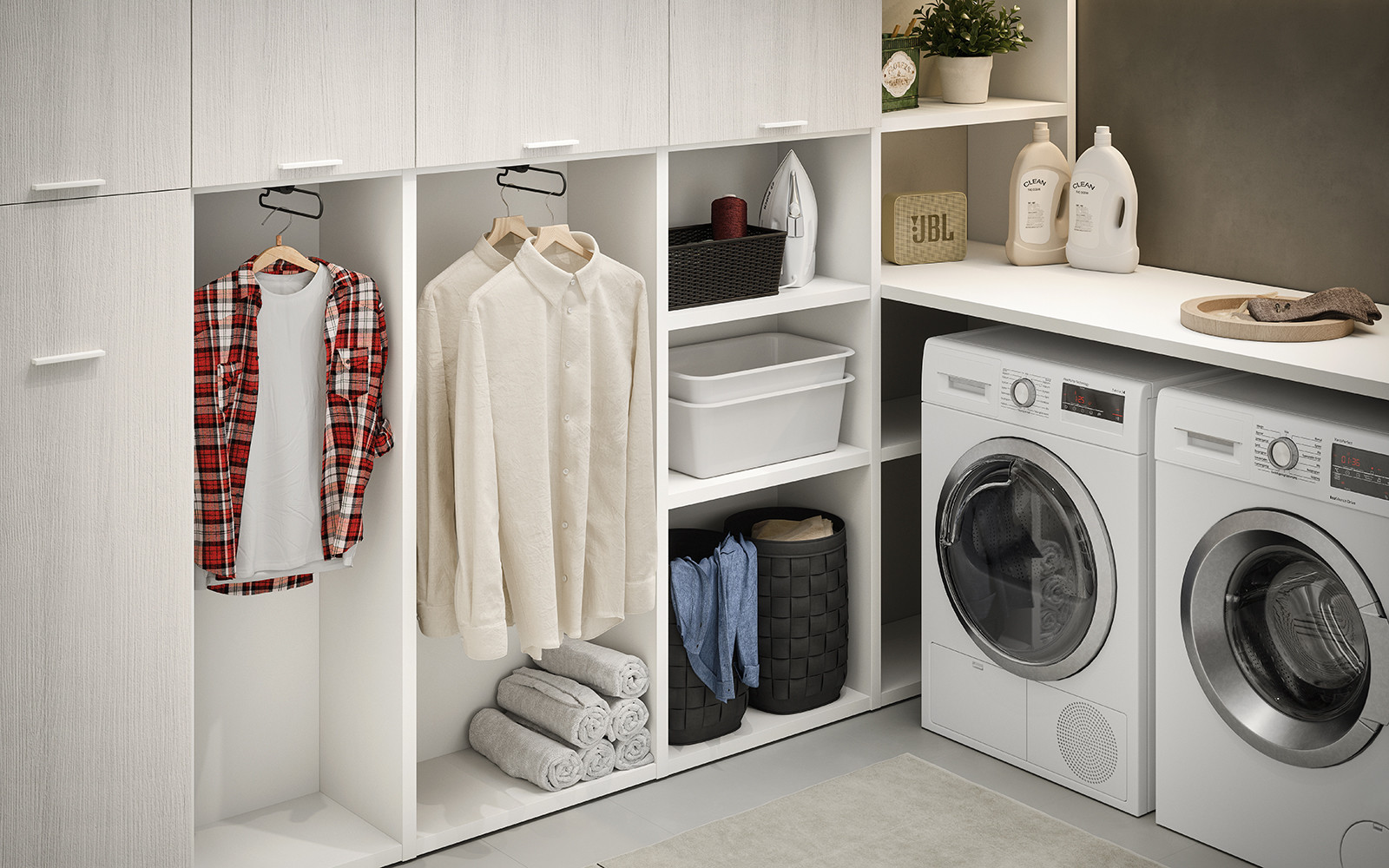Die große Modularität der Elemente ermöglicht es, den verfügbaren Platz optimal zu organisieren, selbst in einem Raum mit Dachschrägen. Dank raumoptimierter Einrichtungslösungen lassen sich auch Hauswirtschafts- oder Abstellräume sinnvoll konzipieren und einrichten. Ein Wasch- und Hauswirtschaftsraum, bei dem der verfügbare Platz intelligent und funktional genutzt wird.