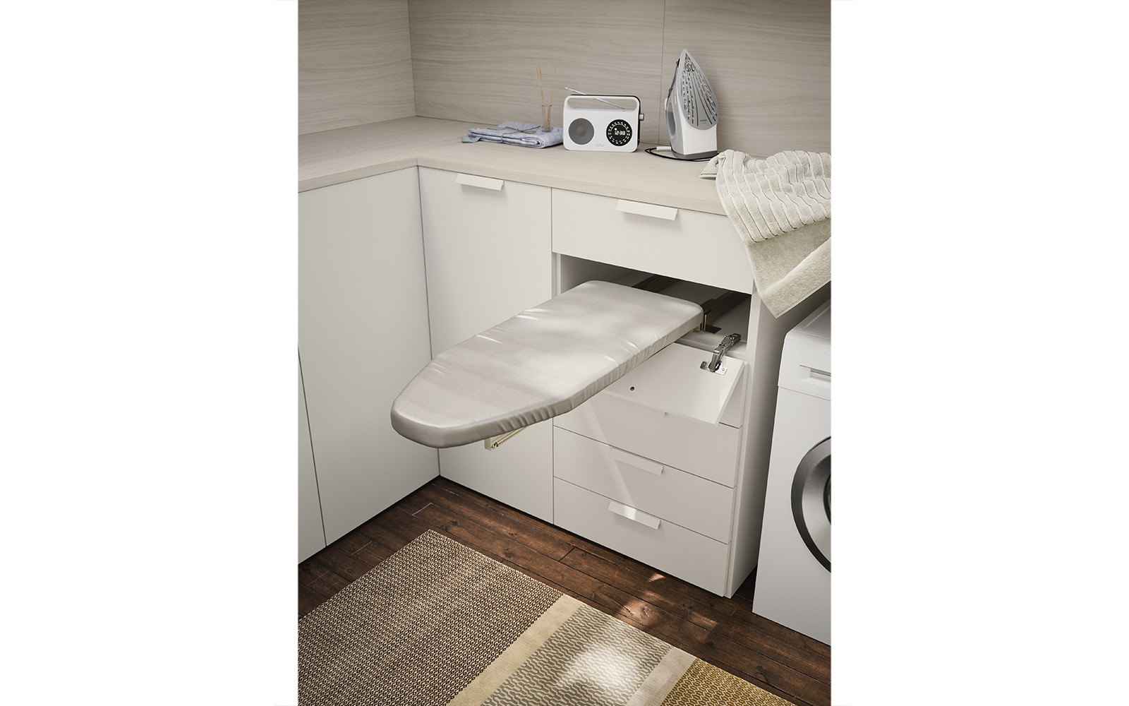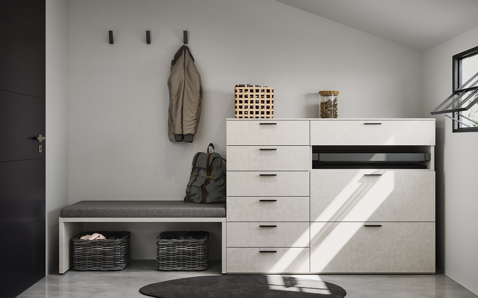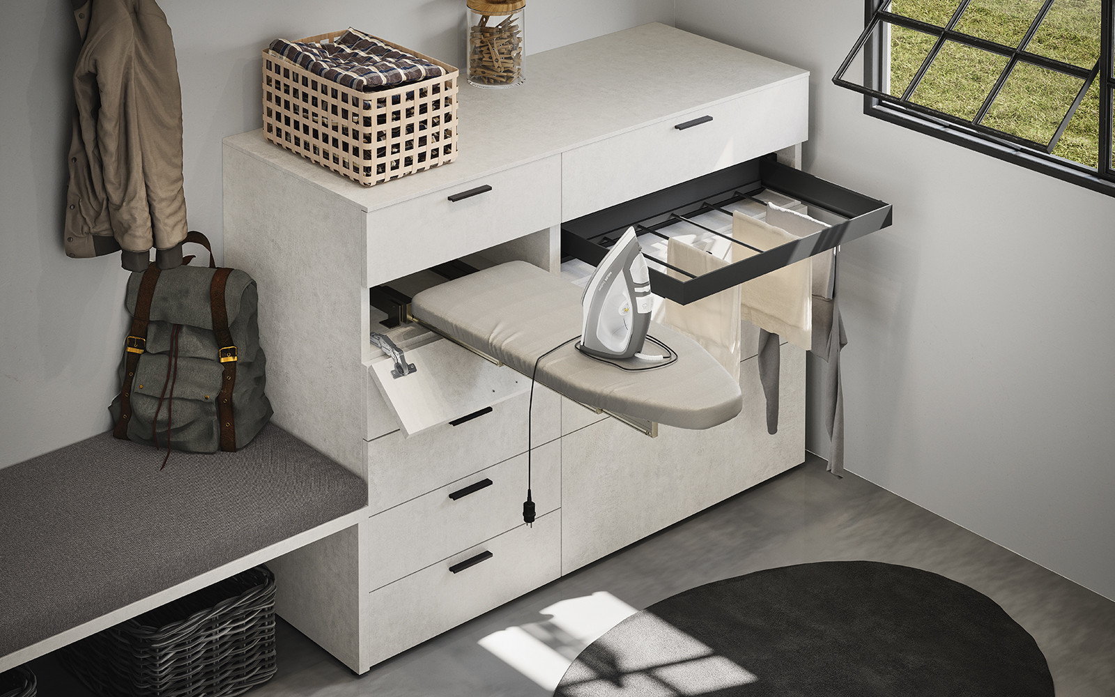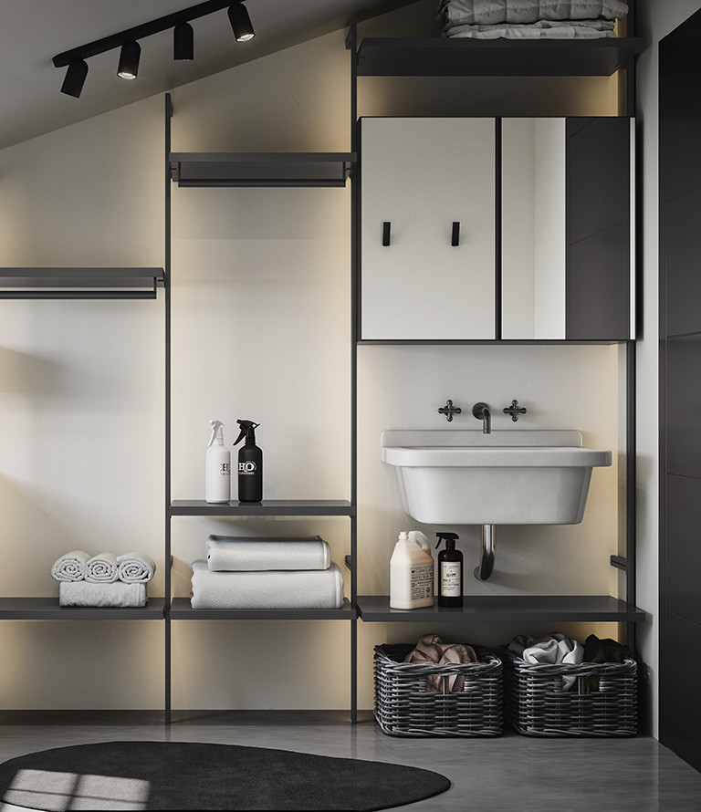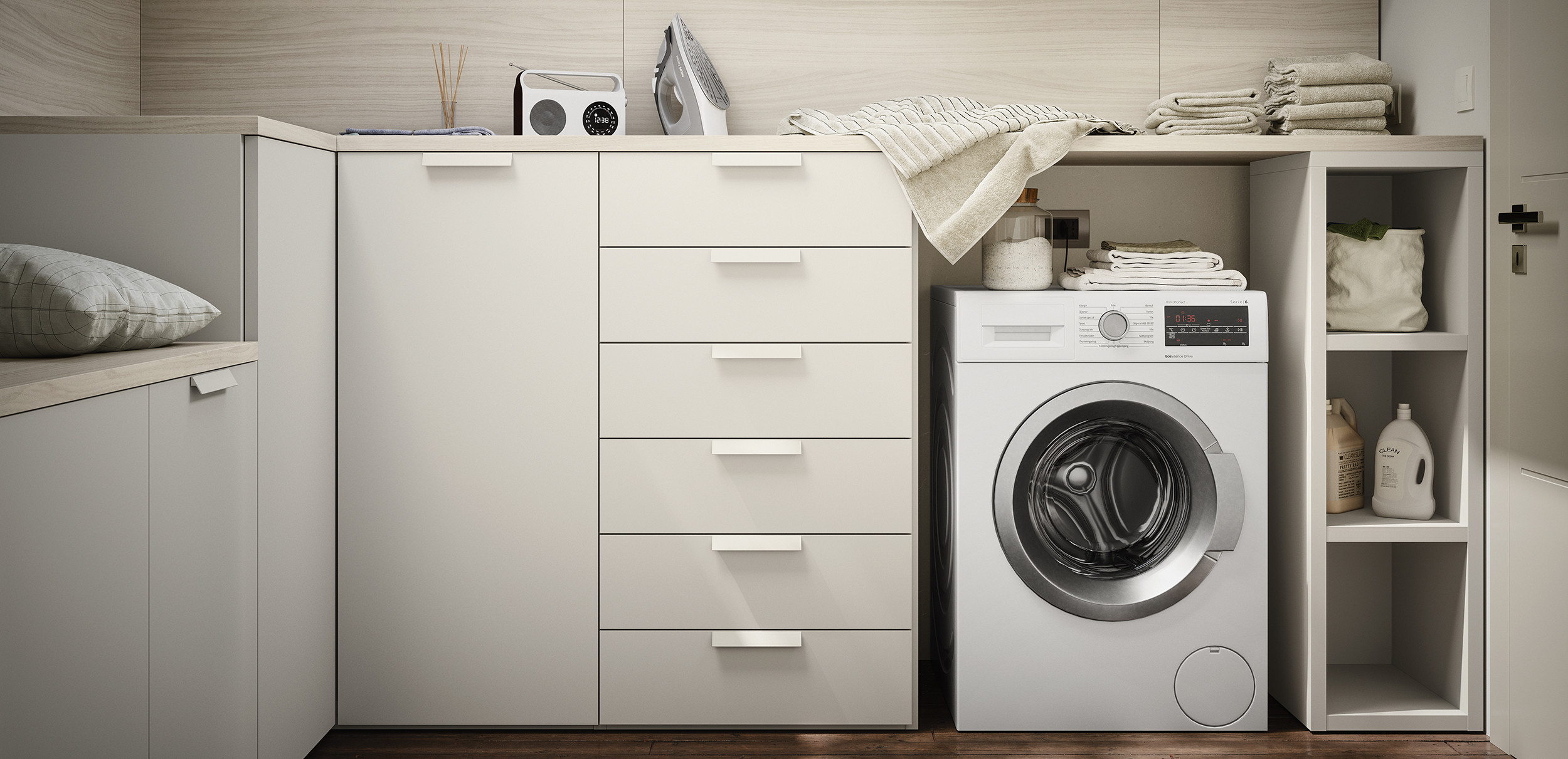Die große Modularität der Elemente ermöglicht es, den verfügbaren Platz optimal zu organisieren, selbst in einem Raum mit Dachschrägen. Dank raumoptimierter Einrichtungslösungen lassen sich auch Hauswirtschafts- oder Abstellräume sinnvoll konzipieren und einrichten. Ein Wasch- und Hauswirtschaftsraum, bei dem der verfügbare Platz intelligent und funktional genutzt wird.