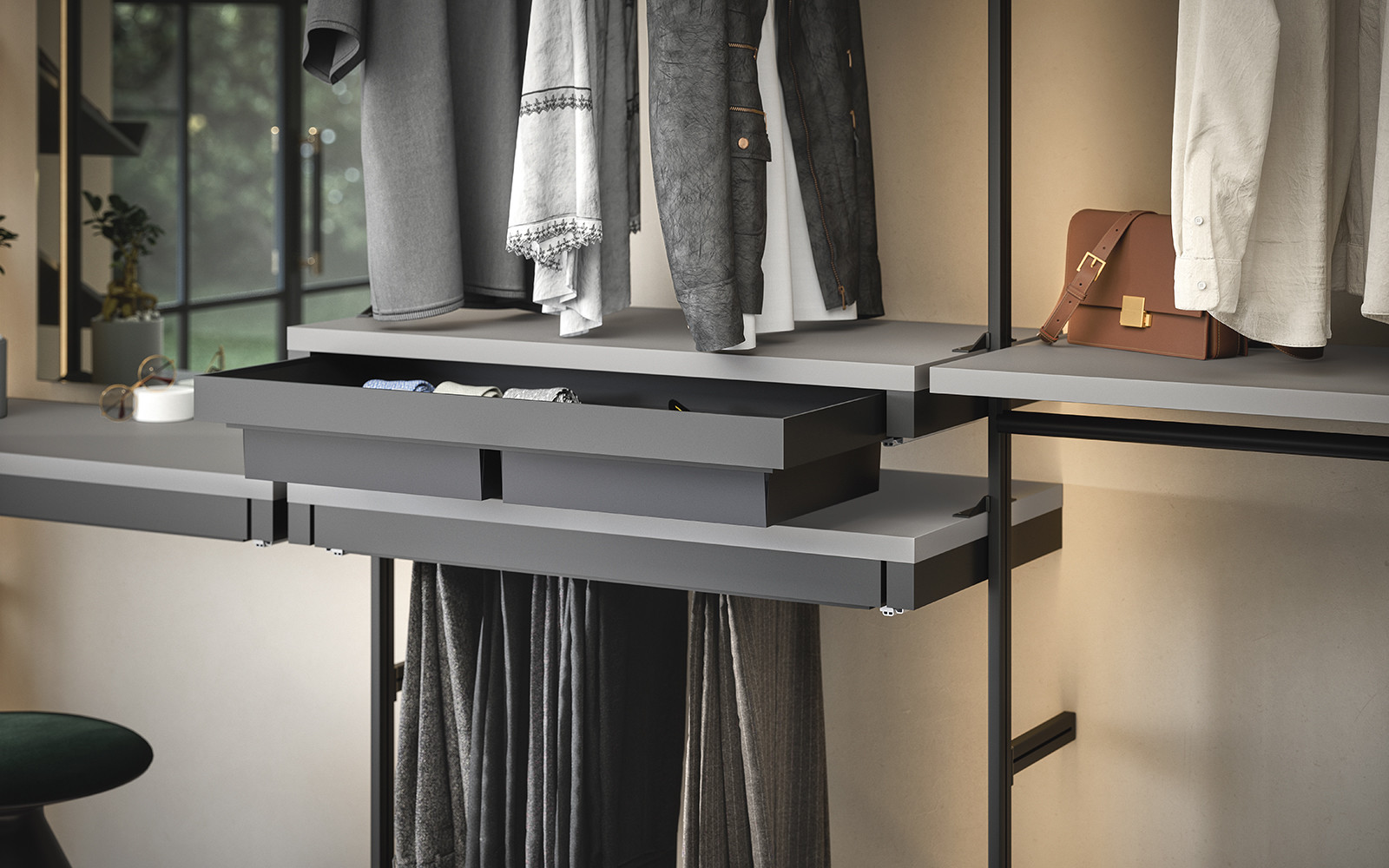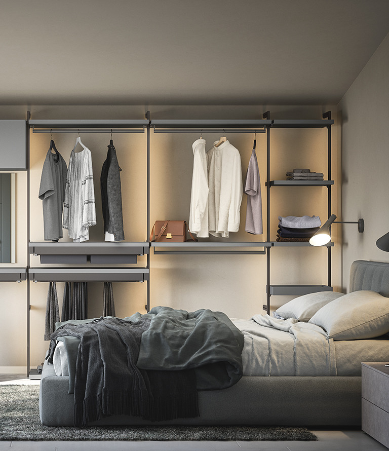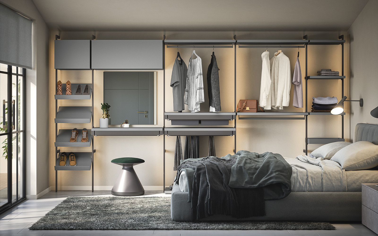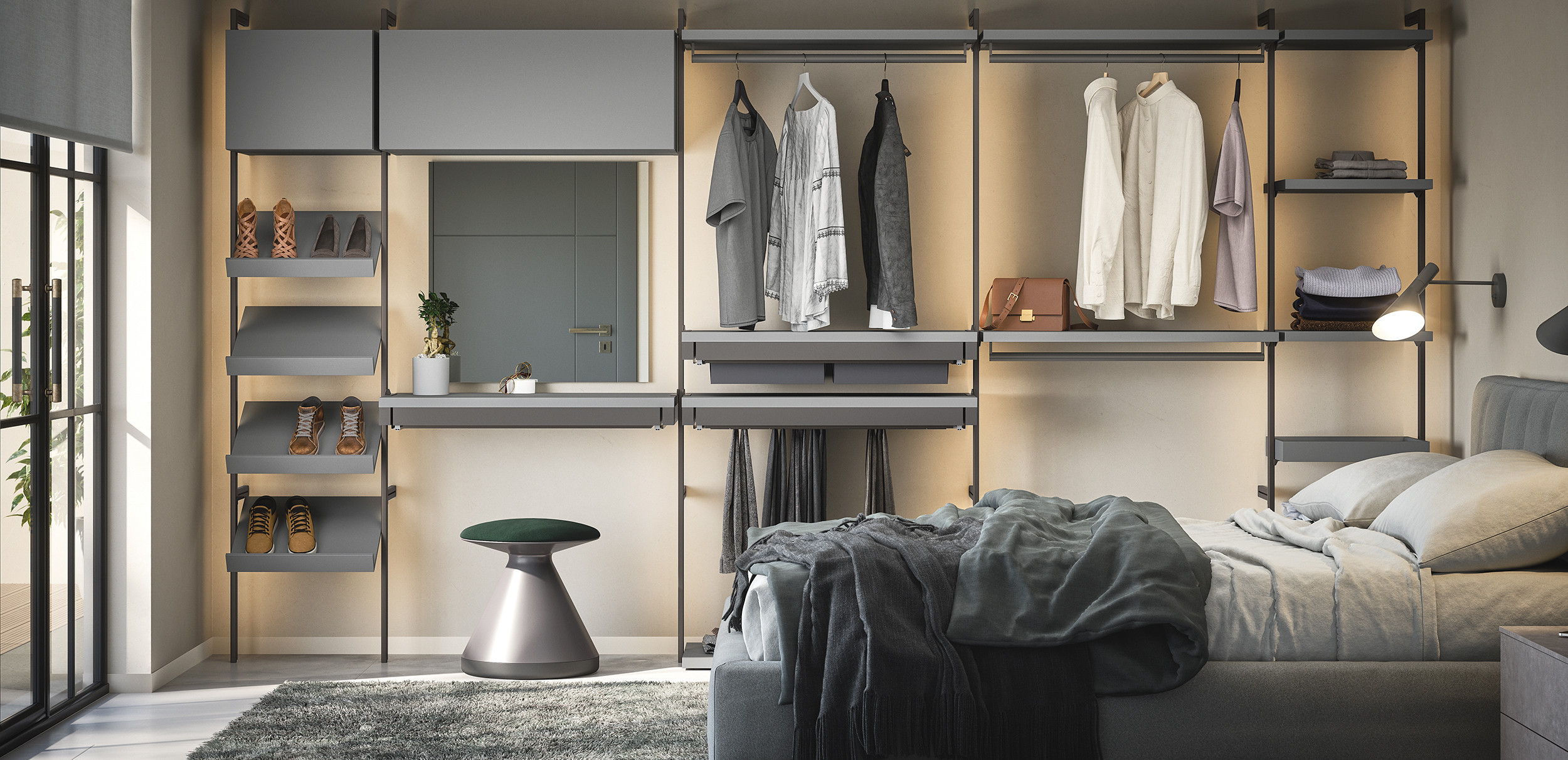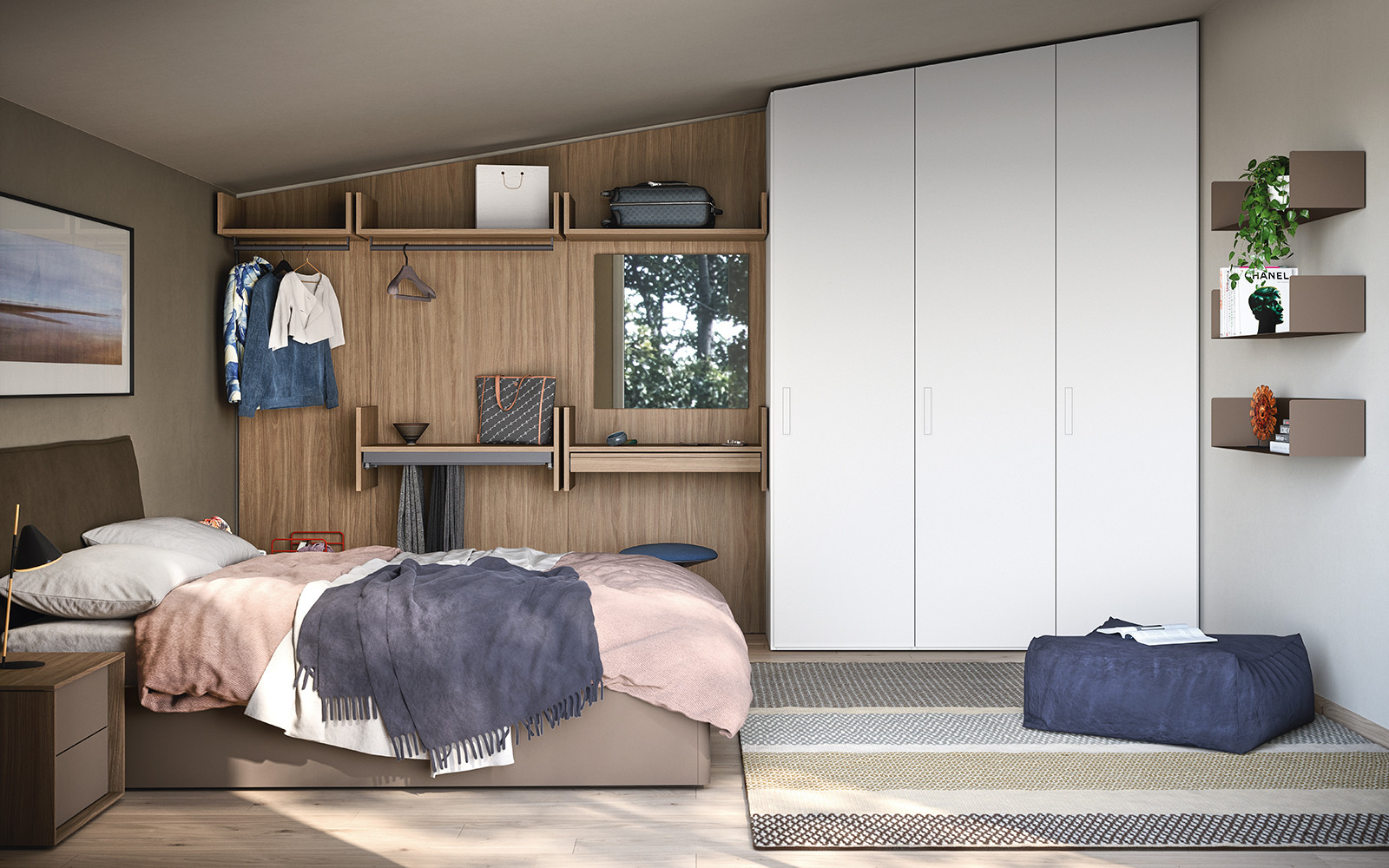 Die modular aufgebauten Elemente des Systems Cinquanta3 ermöglichen die optimale Nutzung des vorhandenen Raumes unter den Dachschrägen. Egal, ob ein gut organisierten Garderoben- oder Kleiderschrank oder eine maßgefertigte Schrankzusammenstellung. Die maßbezogenen Einschränkungen eines Dachgeschosses verwandeln sich in eine gestalterische Chance.
