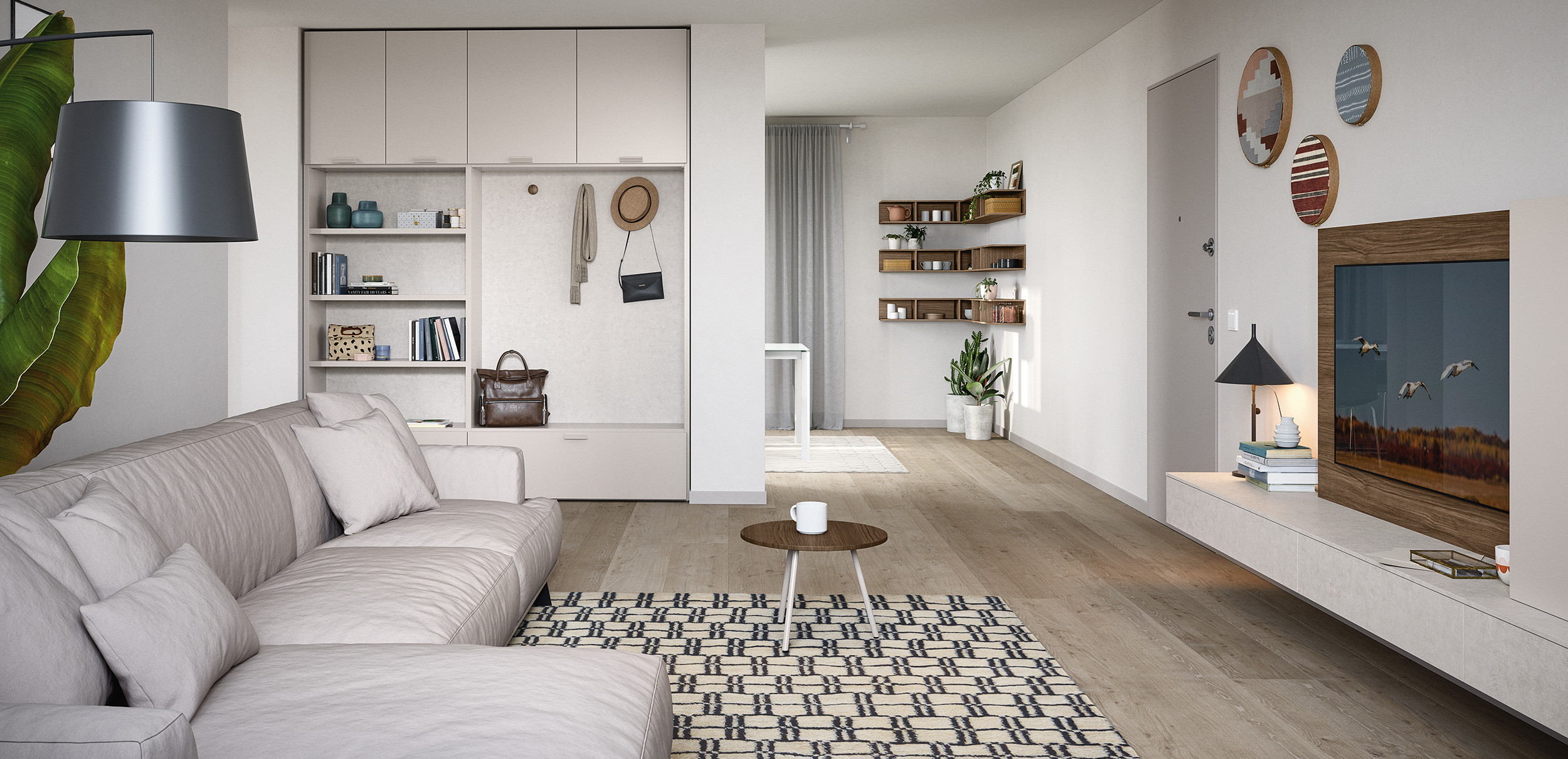 Modular units offering tonnes of storage, perfect for making the design flexible. Organize the room just the way you want, choosing the most appropriate finishes from the range on offer.