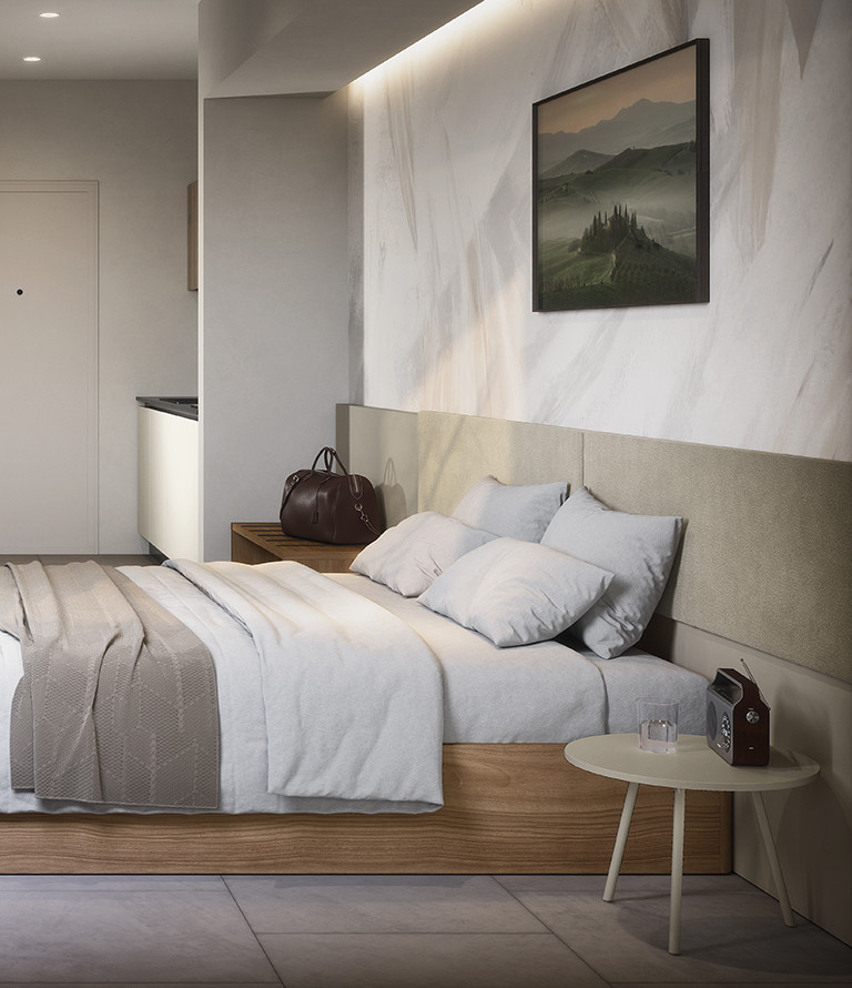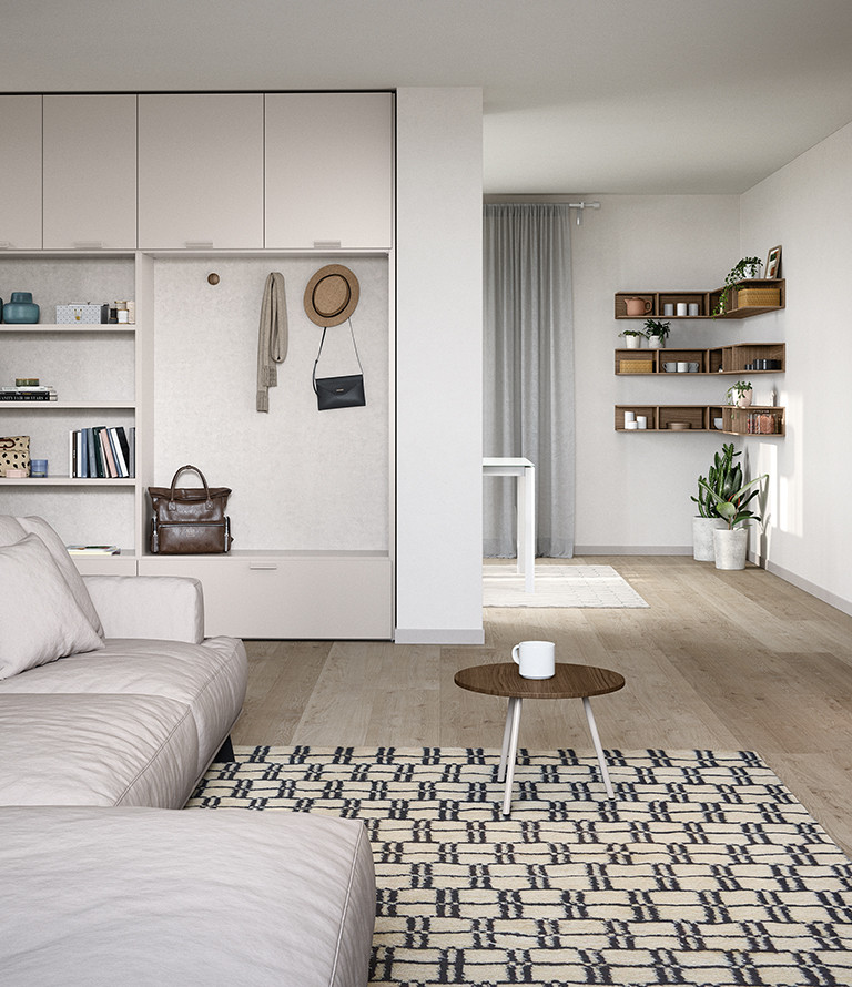 Wall panelling adds a decorative finishing touch to the configuration, being able to accommodate shelves, wall units, and floorstanding or wall-mounted base units. An ideal solution for giving the space a distinctive look, helped by the range of different colours and finishes on offer.