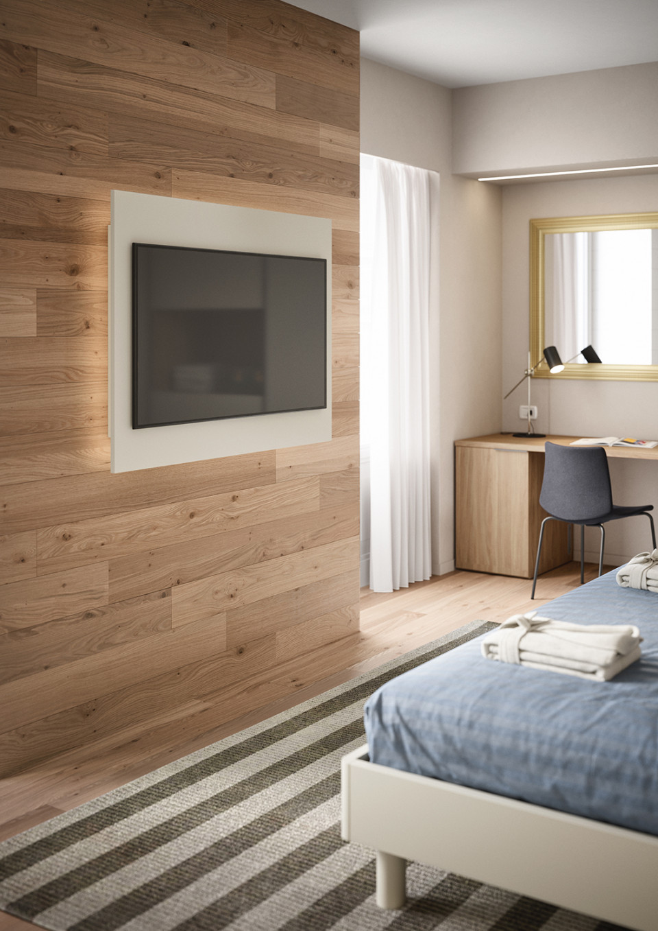 Looking for a modern idea with a clean design? The TV mounting panel adds the finishing touch to the wall, injecting style and function into the scheme, to optimize the space efficiently.
