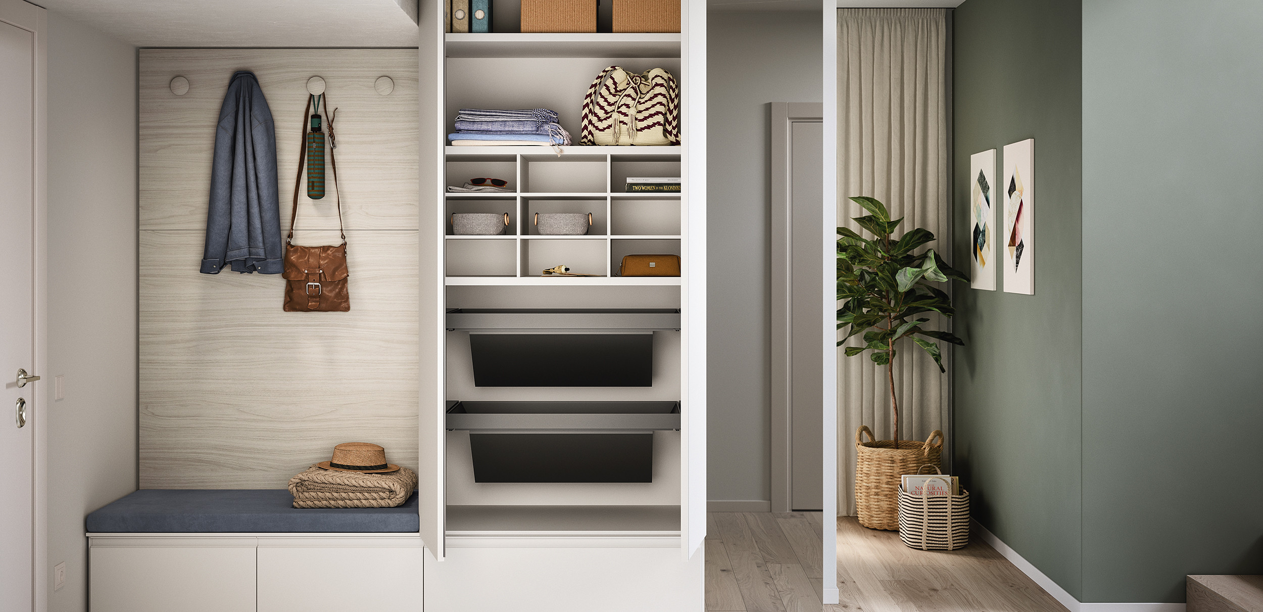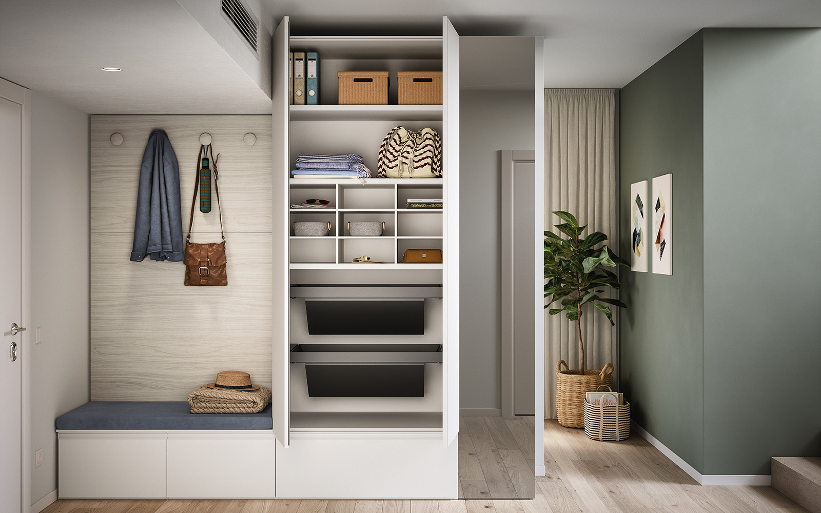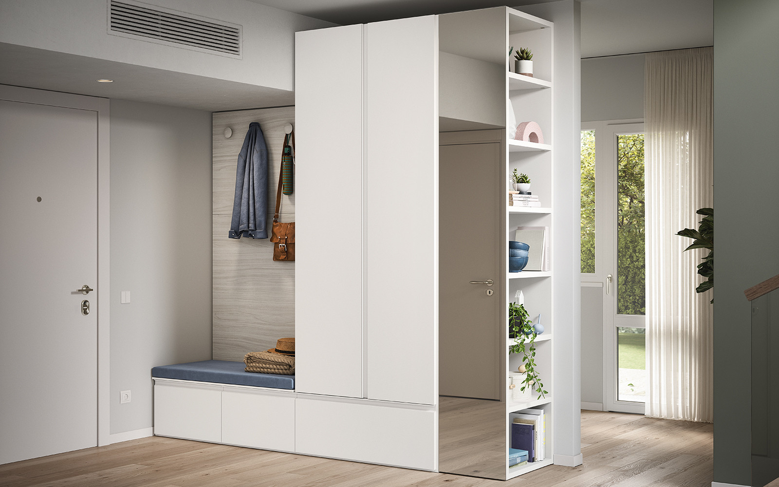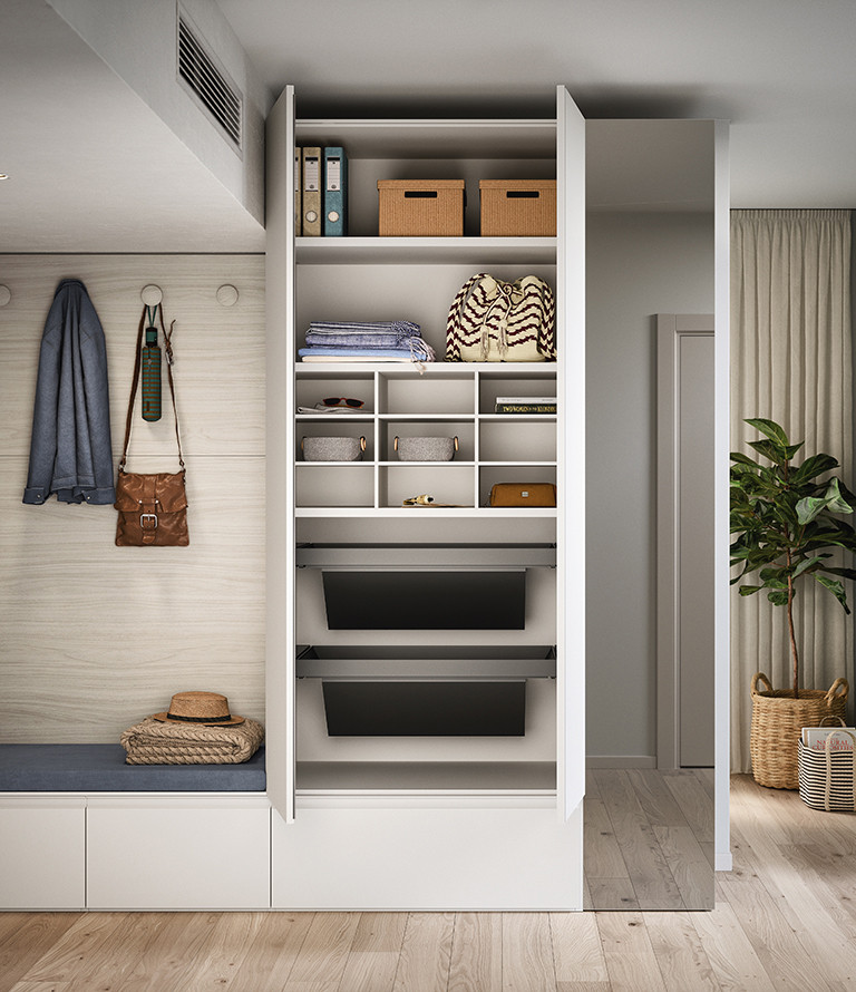 The different configurations offer functional solutions to deal with a bulkhead protruding into an entrance. A way to make the best use of space, redefining the interior based on its design details with the aid of elements featuring a modular design providing plenty of options, resolving different home spaces with a stylish fitout.