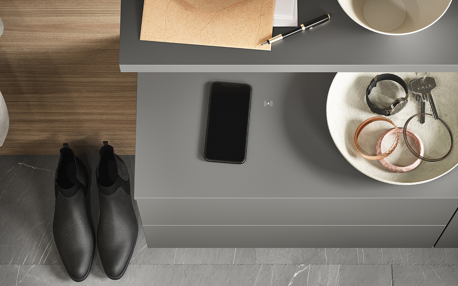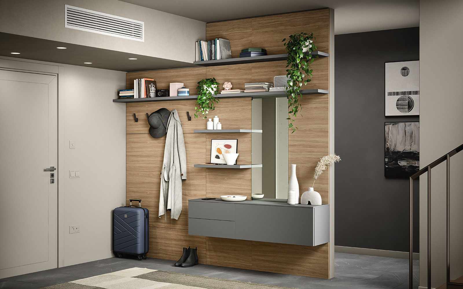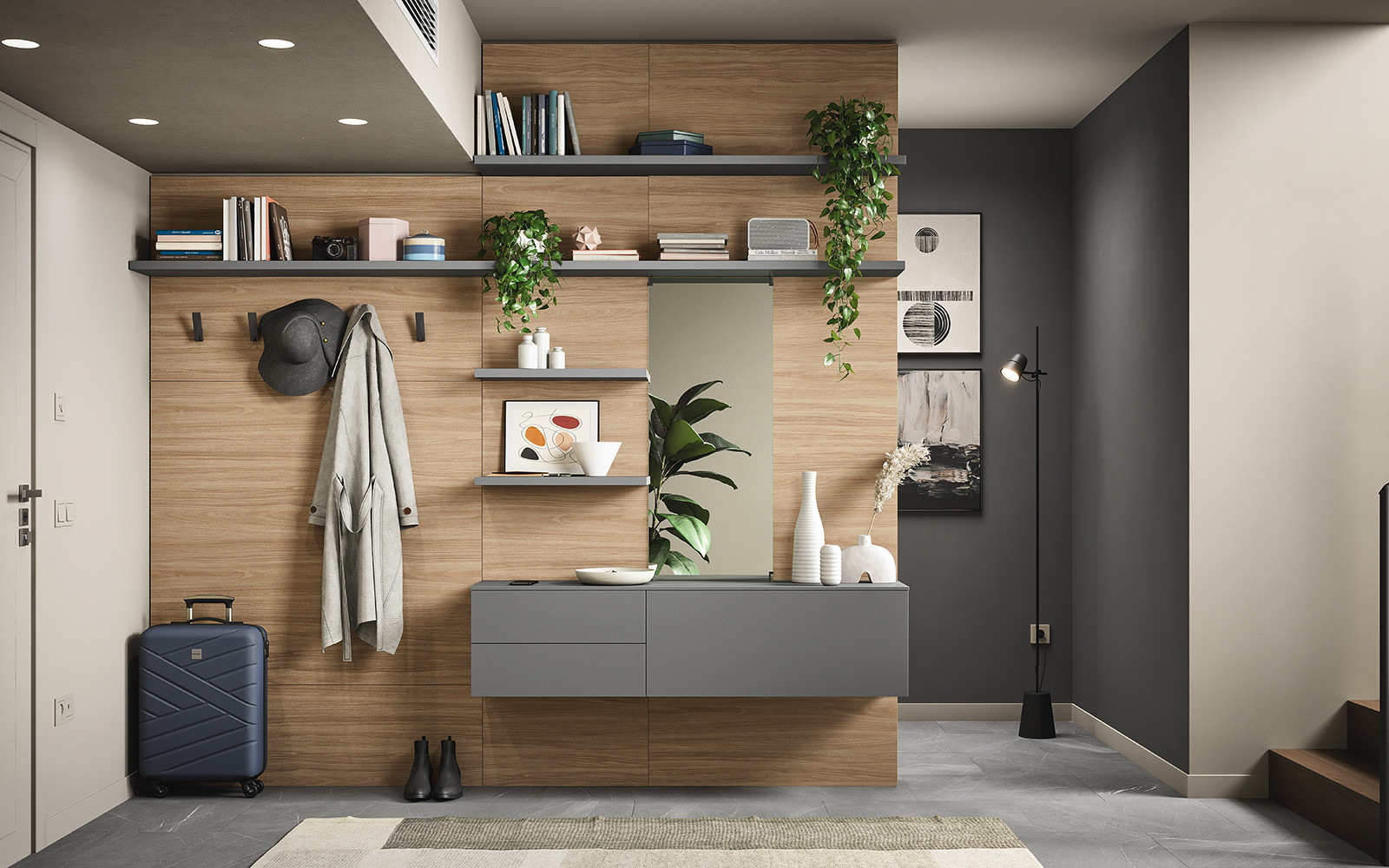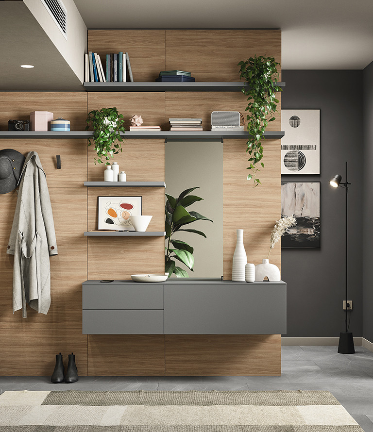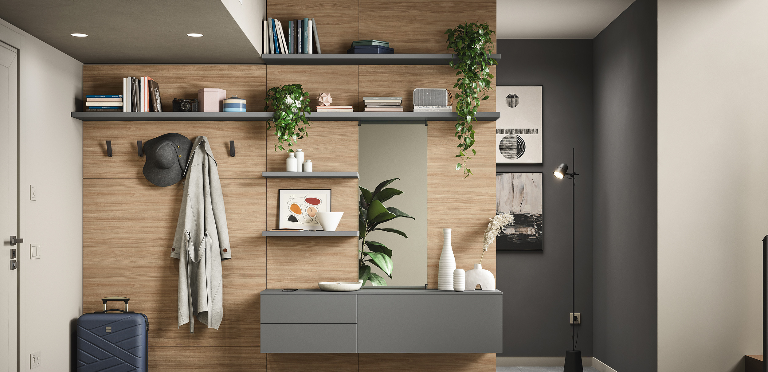 Wall panelling adds a decorative finishing touch to the configuration, being able to accommodate shelves, wall units, and floorstanding or wall-mounted base units. An ideal solution for giving the space a distinctive look, helped by the range of different colours and finishes on offer.