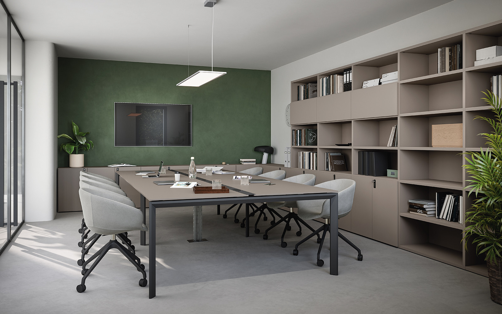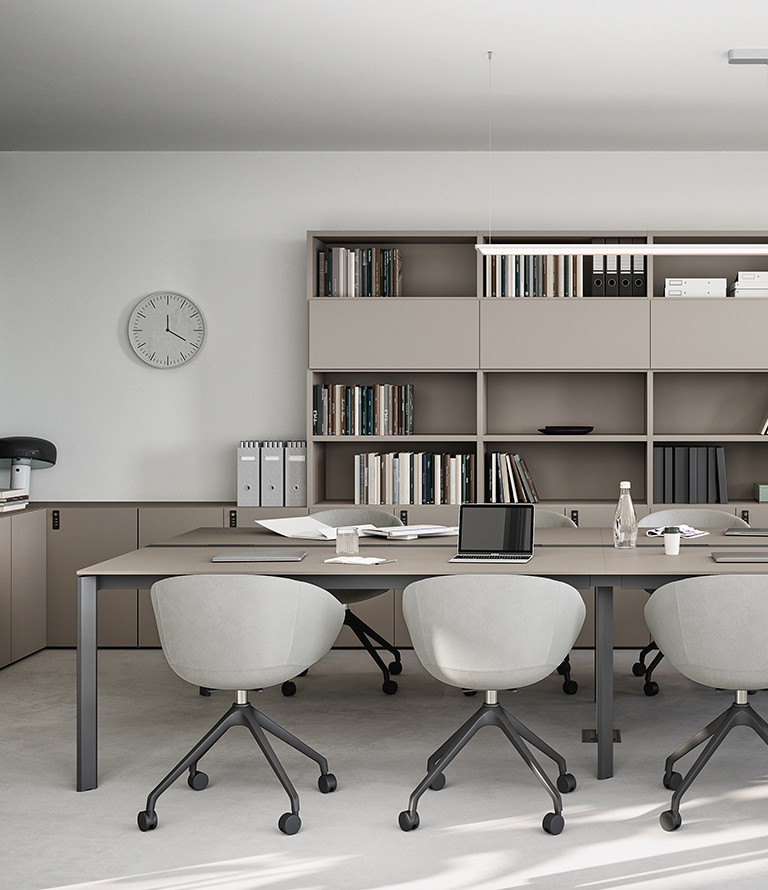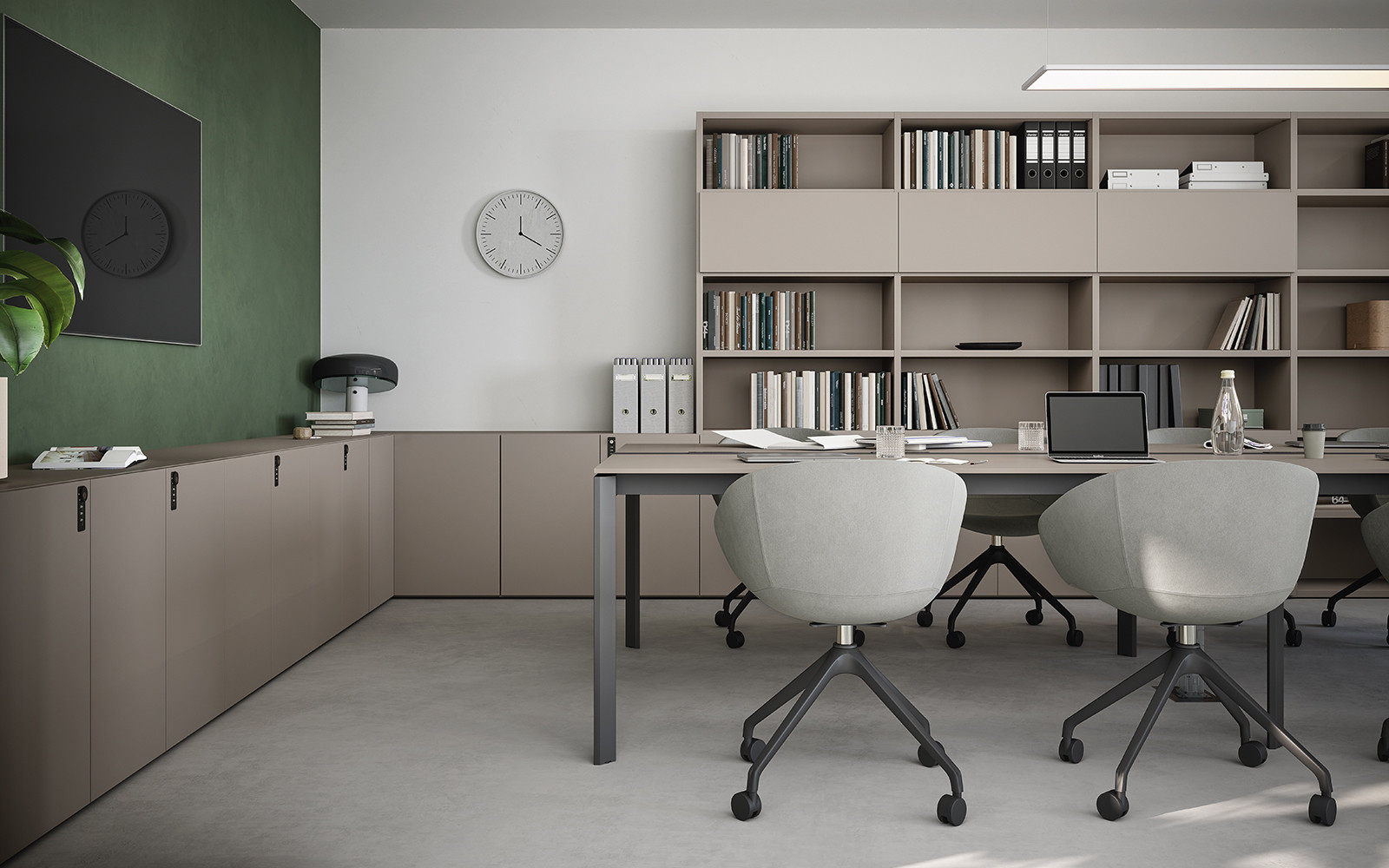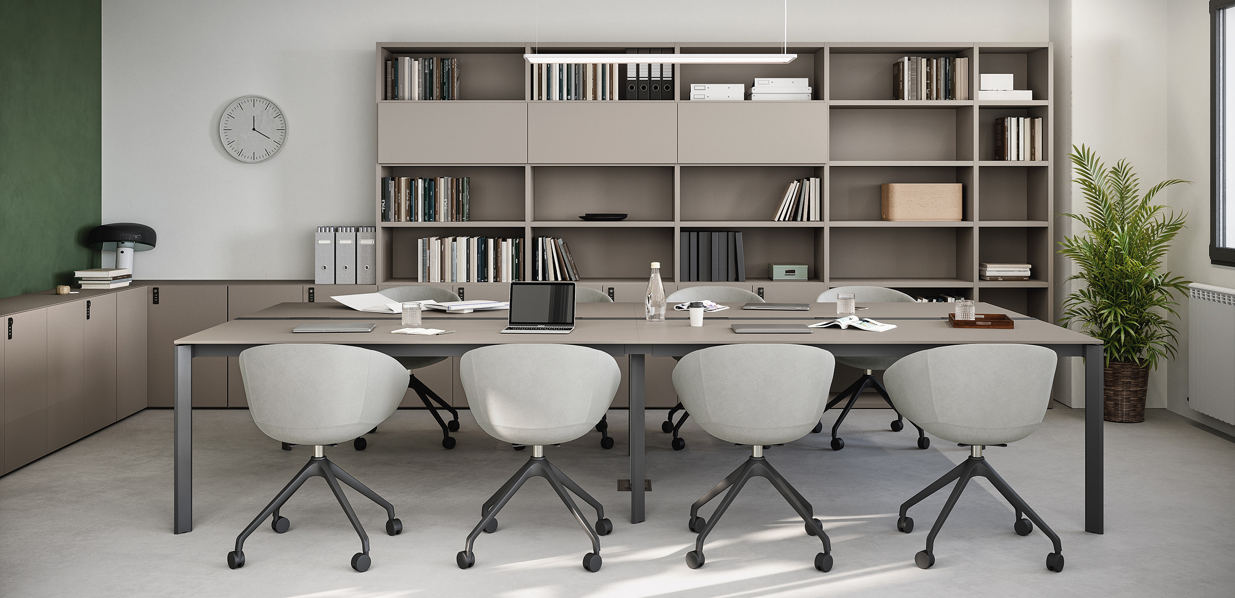 Shared spaces and practicality inform the layout: common areas are turned into places where people can come together and exchange ideas; workspaces where the furniture is designed, above all, to accommodate the occupants' everyday tasks. Functional elements for a design that focuses on ergonomic solutions.