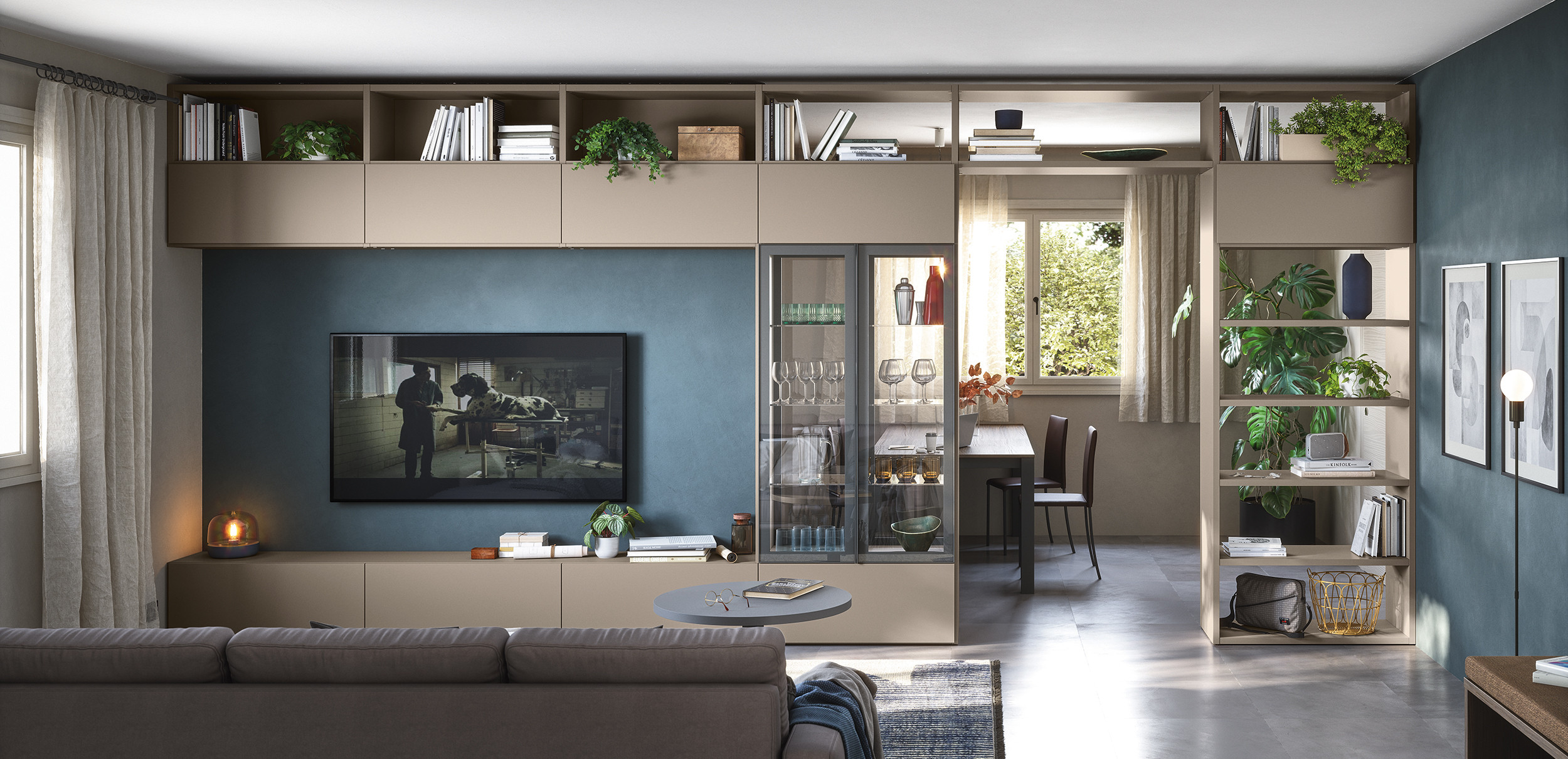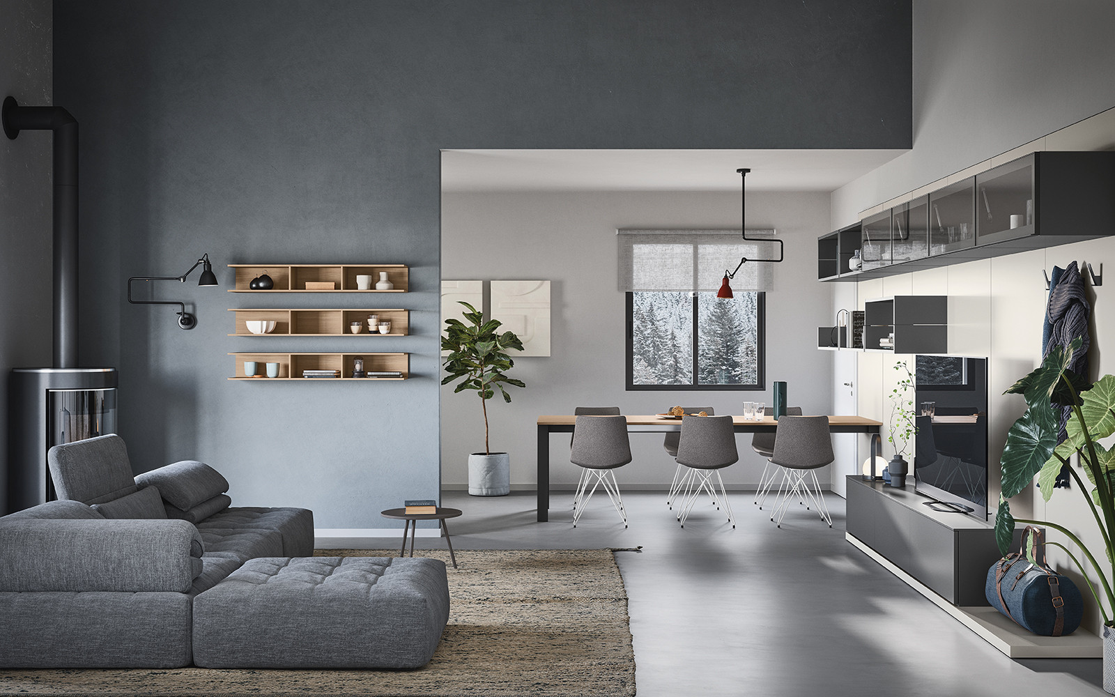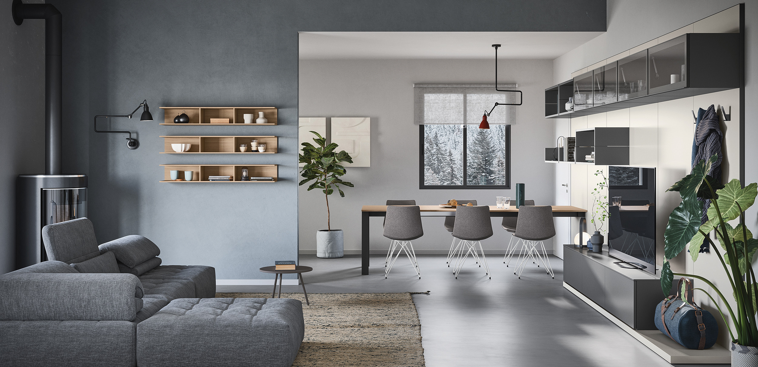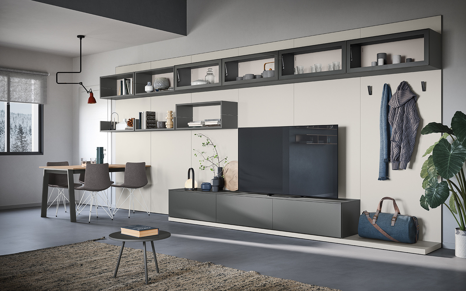 La boiserie decora y completa la composición: se puede equipar con repisas, colgantes y bases de suelo o suspendidas. Una solución ideal para caracterizar el espacio, gracias también a los distintos colores y acabados disponibles.