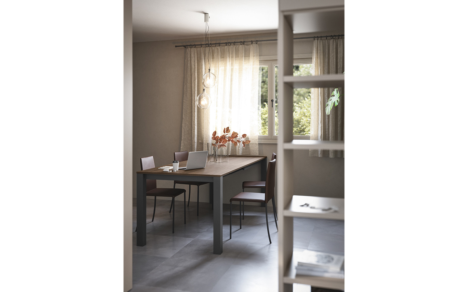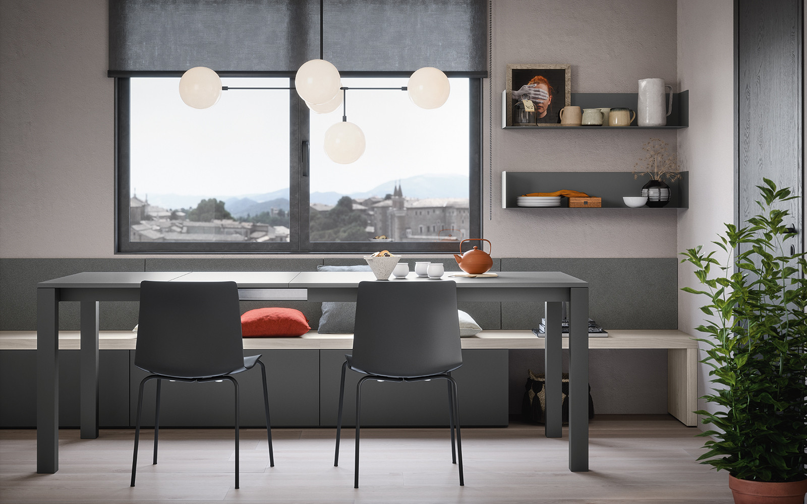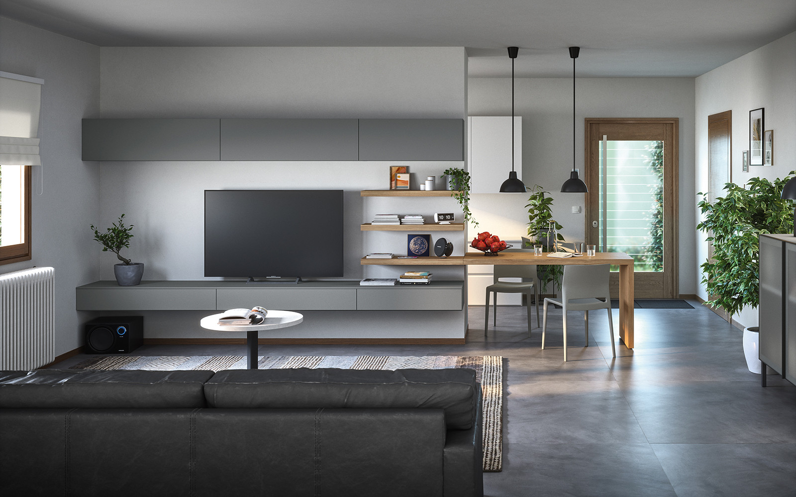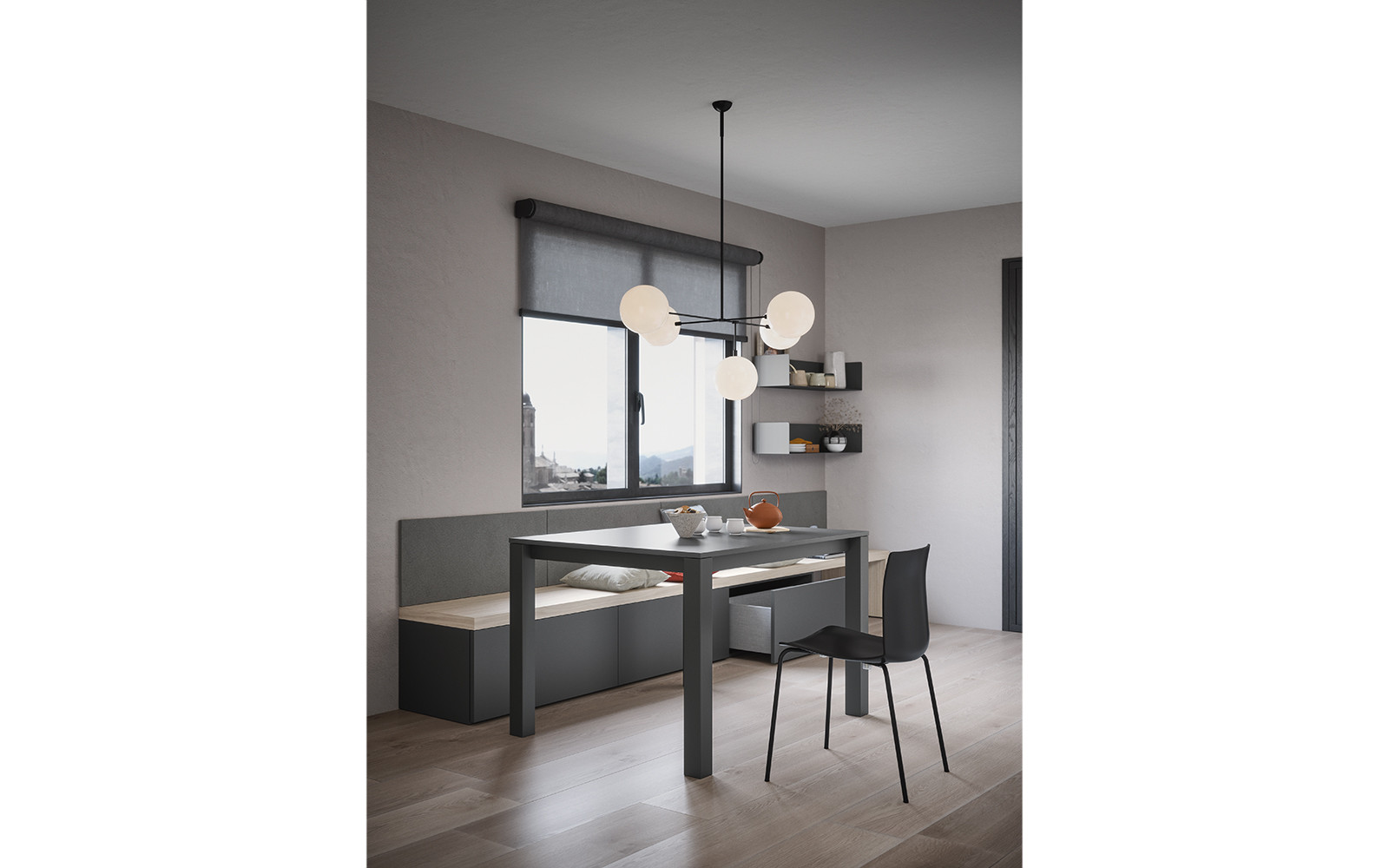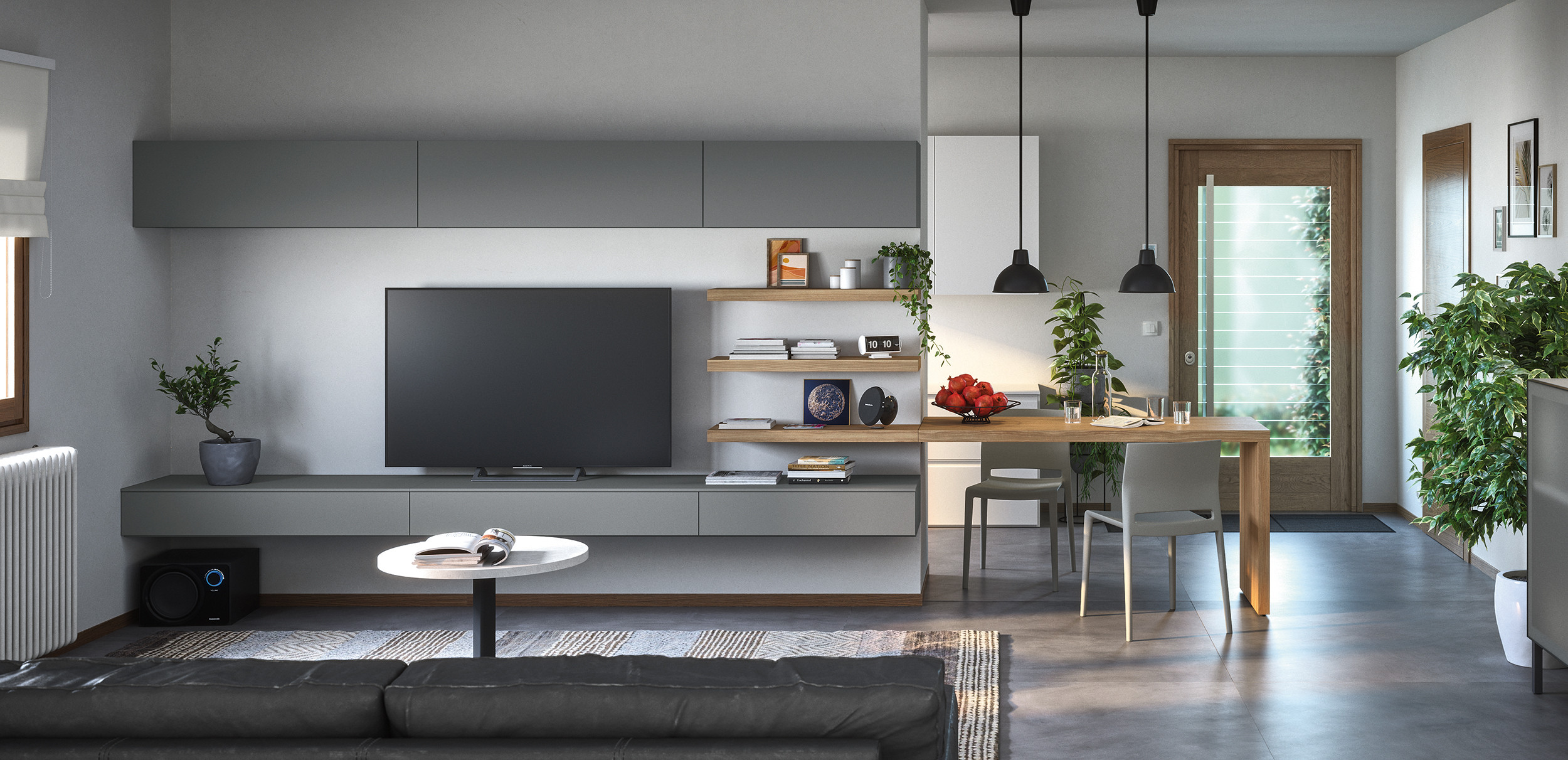 La boiserie decora y completa la composición: se puede equipar con repisas, colgantes y bases de suelo o suspendidas. Una solución ideal para caracterizar el espacio, gracias también a los distintos colores y acabados disponibles.