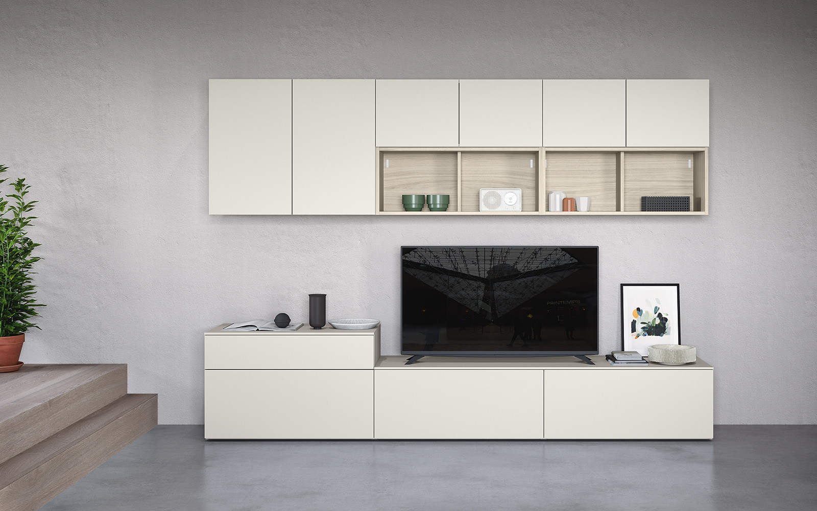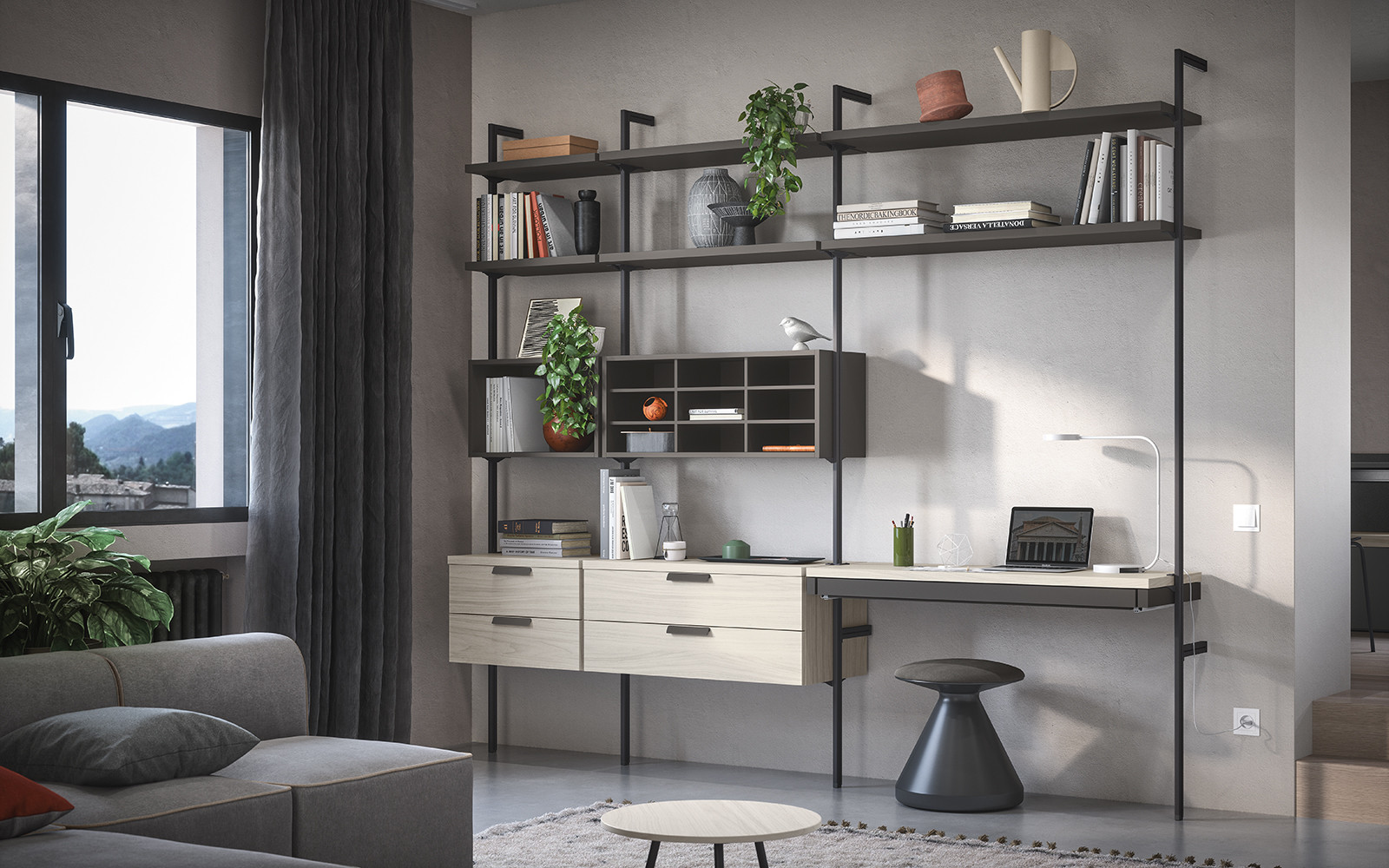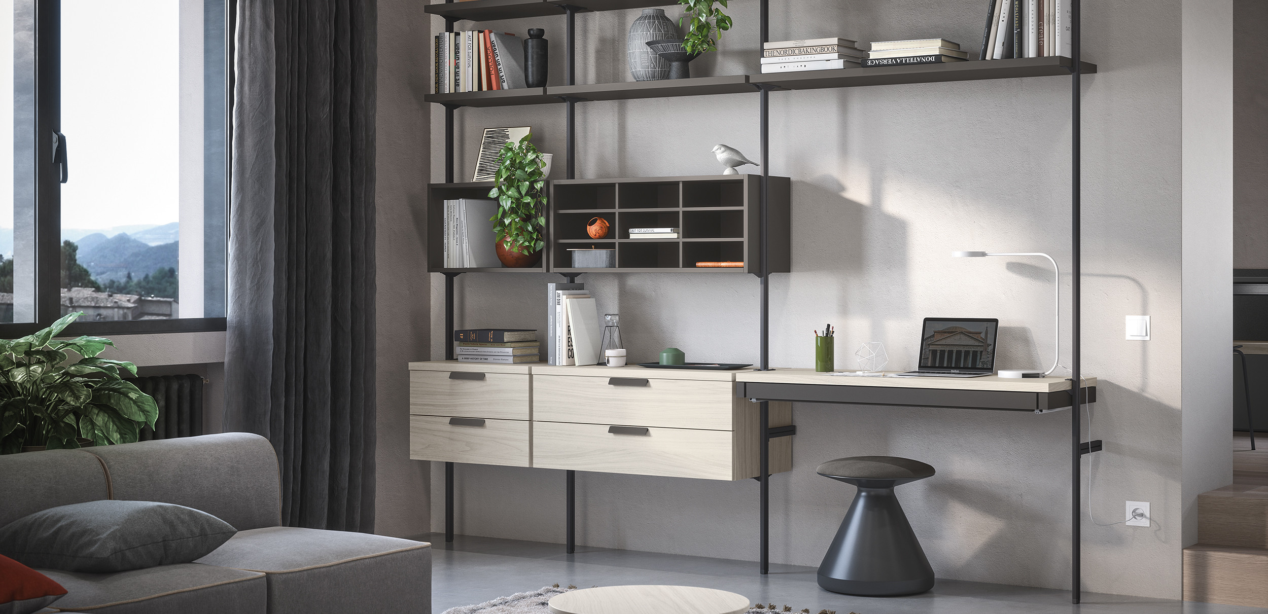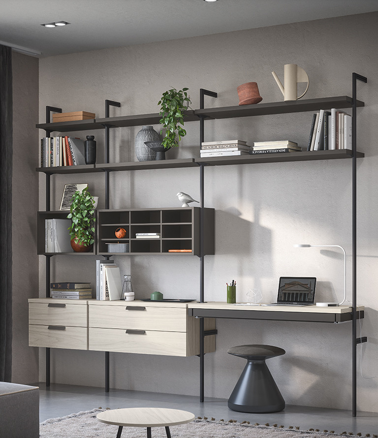 Un sistema caracterizado por sus montantes de metal, que sostienen los elementos de la composición. El diseño contemporáneo de Uniko ofrece soluciones decorativas que mantienen despejado el ambiente. Una forma de organizar la pared con un estilo que no pasa desapercibido.