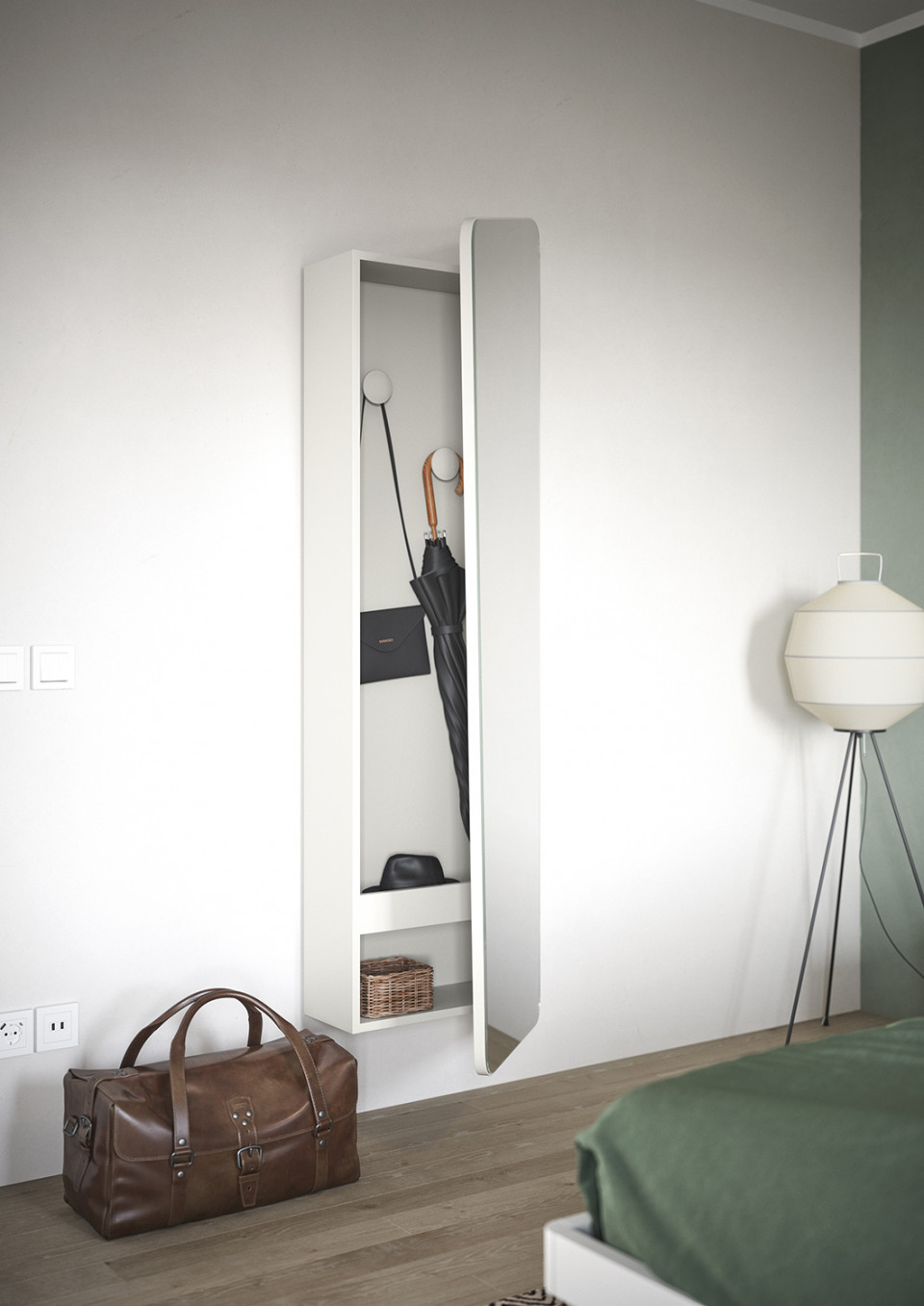 El contenedor Ginevra está concebido como un elemento de servicio para guardar objetos de uso cotidiano, manteniendo la habitación ordenada y funcional. En función de las necesidades, está disponible con puerta de espejo.