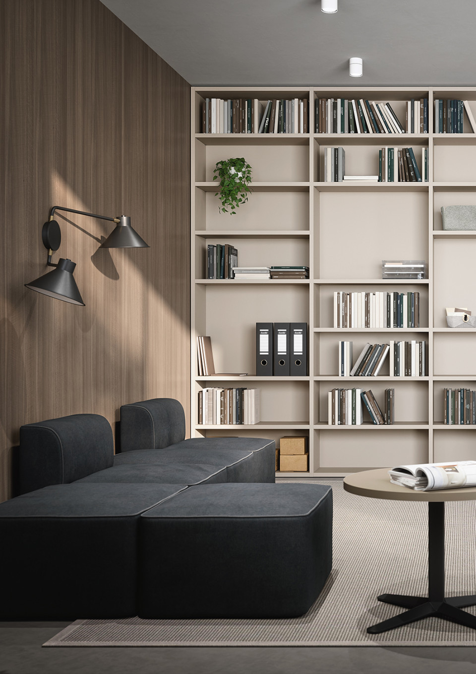 La boiserie decora y completa la composición: se puede equipar con repisas, colgantes y bases de suelo o suspendidas. Una solución ideal para caracterizar el espacio, gracias también a los distintos colores y acabados disponibles.