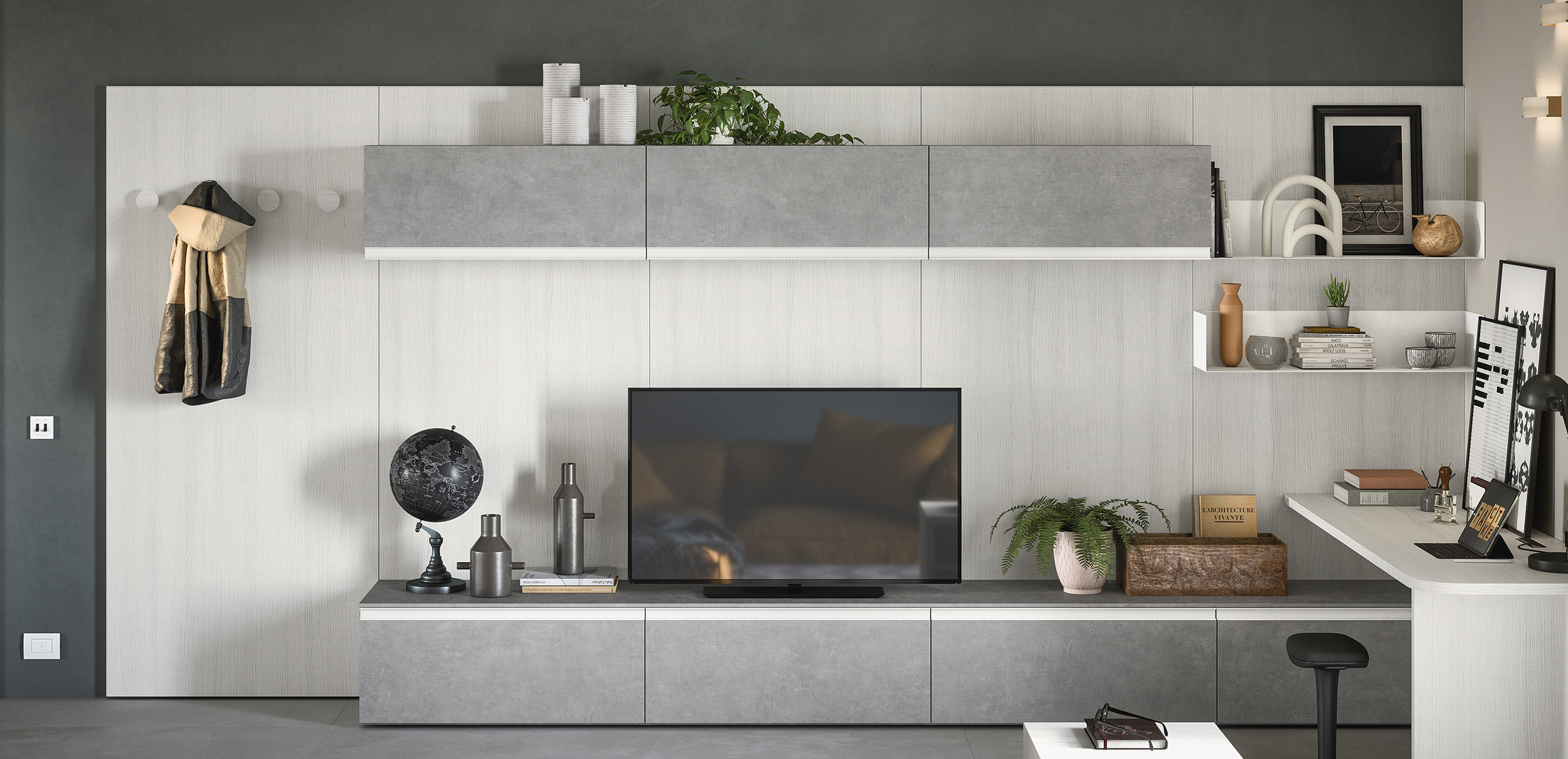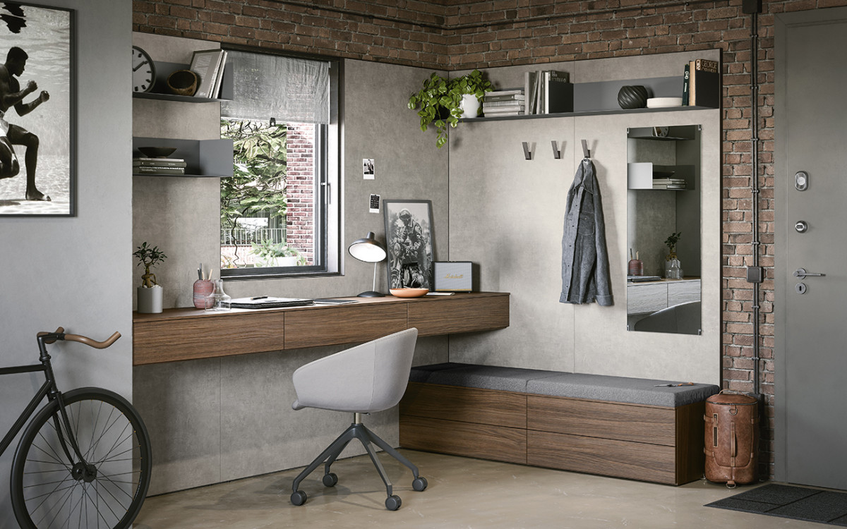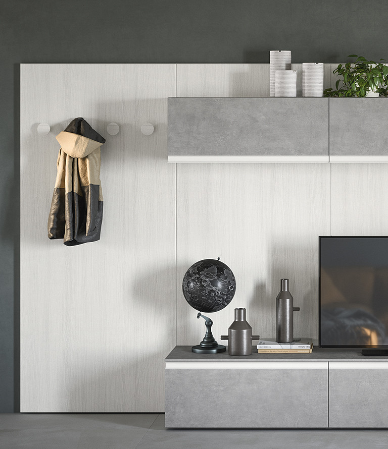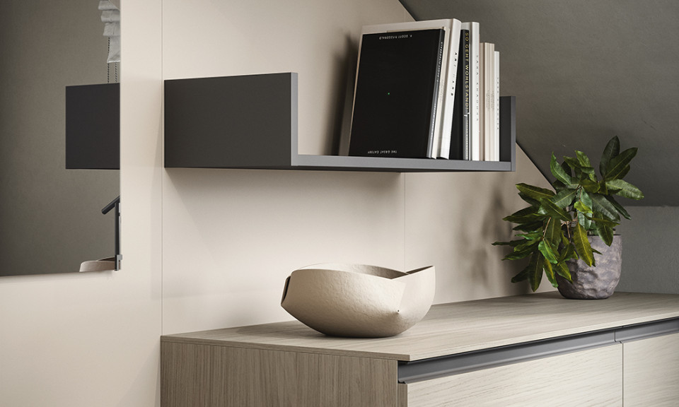 La boiserie decora y completa la composición: se puede equipar con repisas, colgantes y bases de suelo o suspendidas. Una solución ideal para caracterizar el espacio, gracias también a los distintos colores y acabados disponibles.