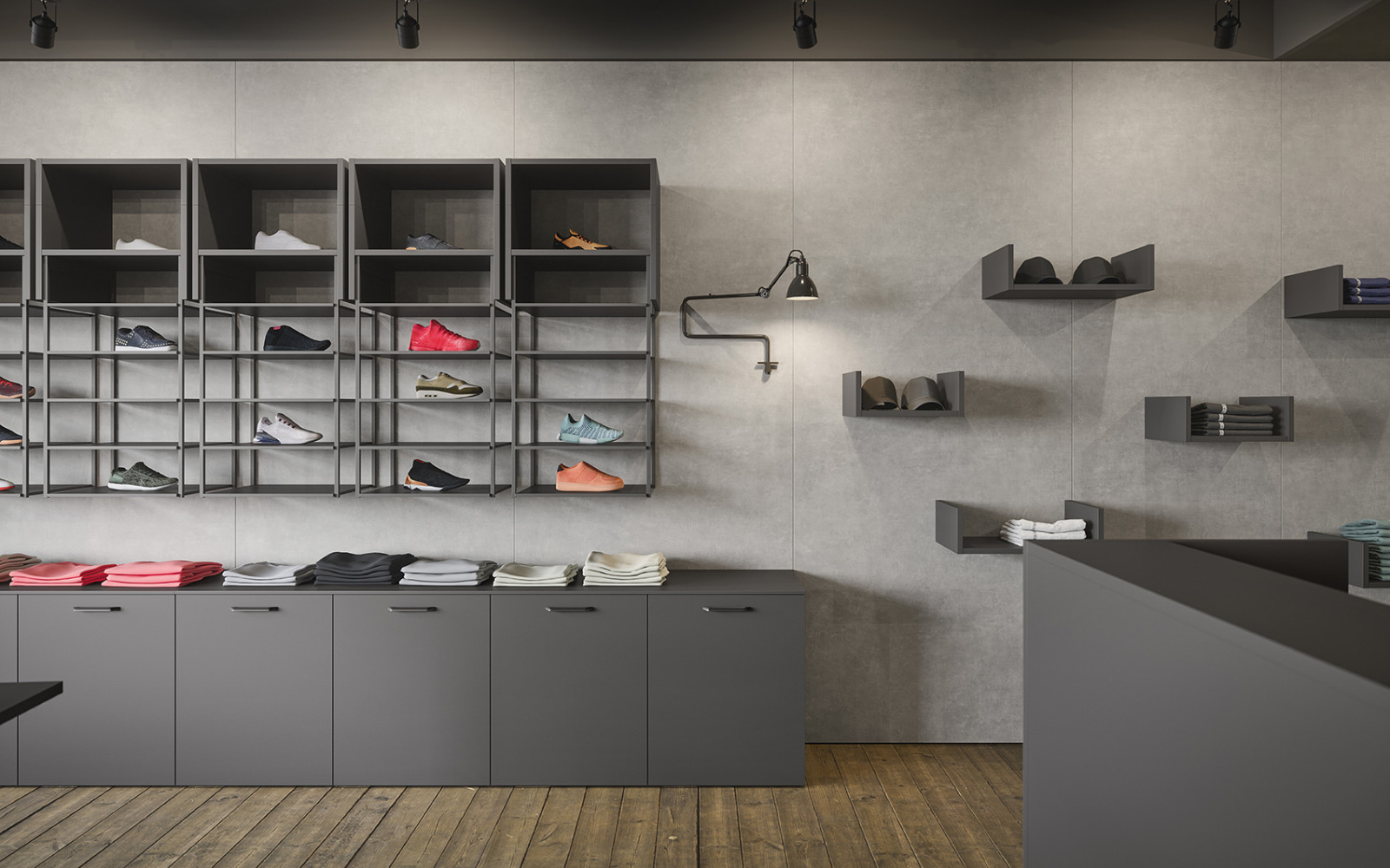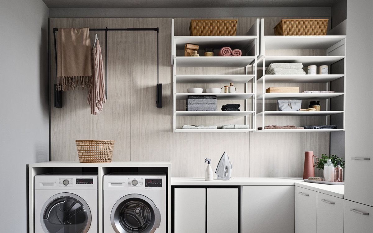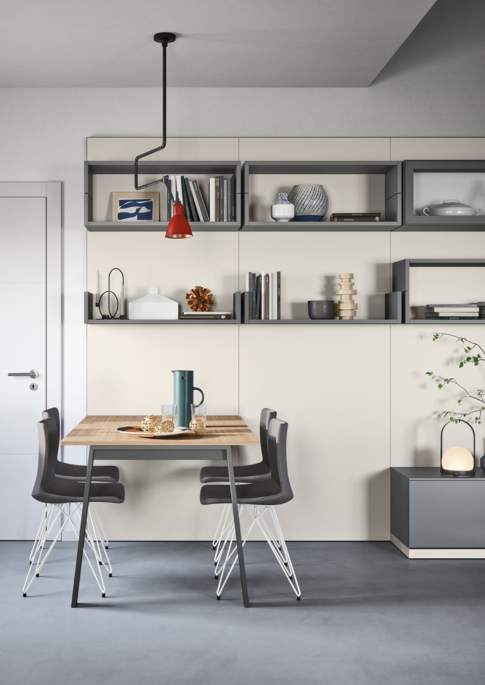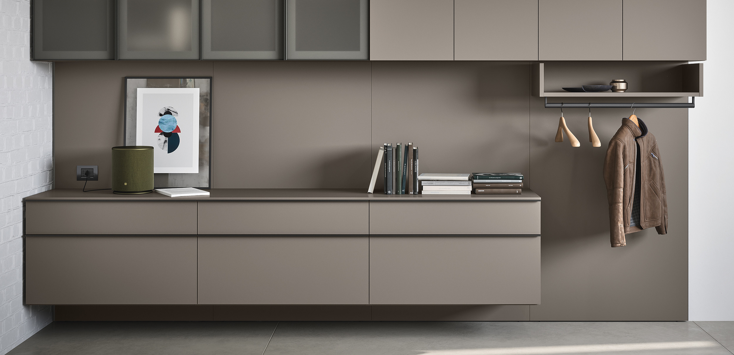 La boiserie decora y completa la composición: se puede equipar con repisas, colgantes y bases de suelo o suspendidas. Una solución ideal para caracterizar el espacio, gracias también a los distintos colores y acabados disponibles.