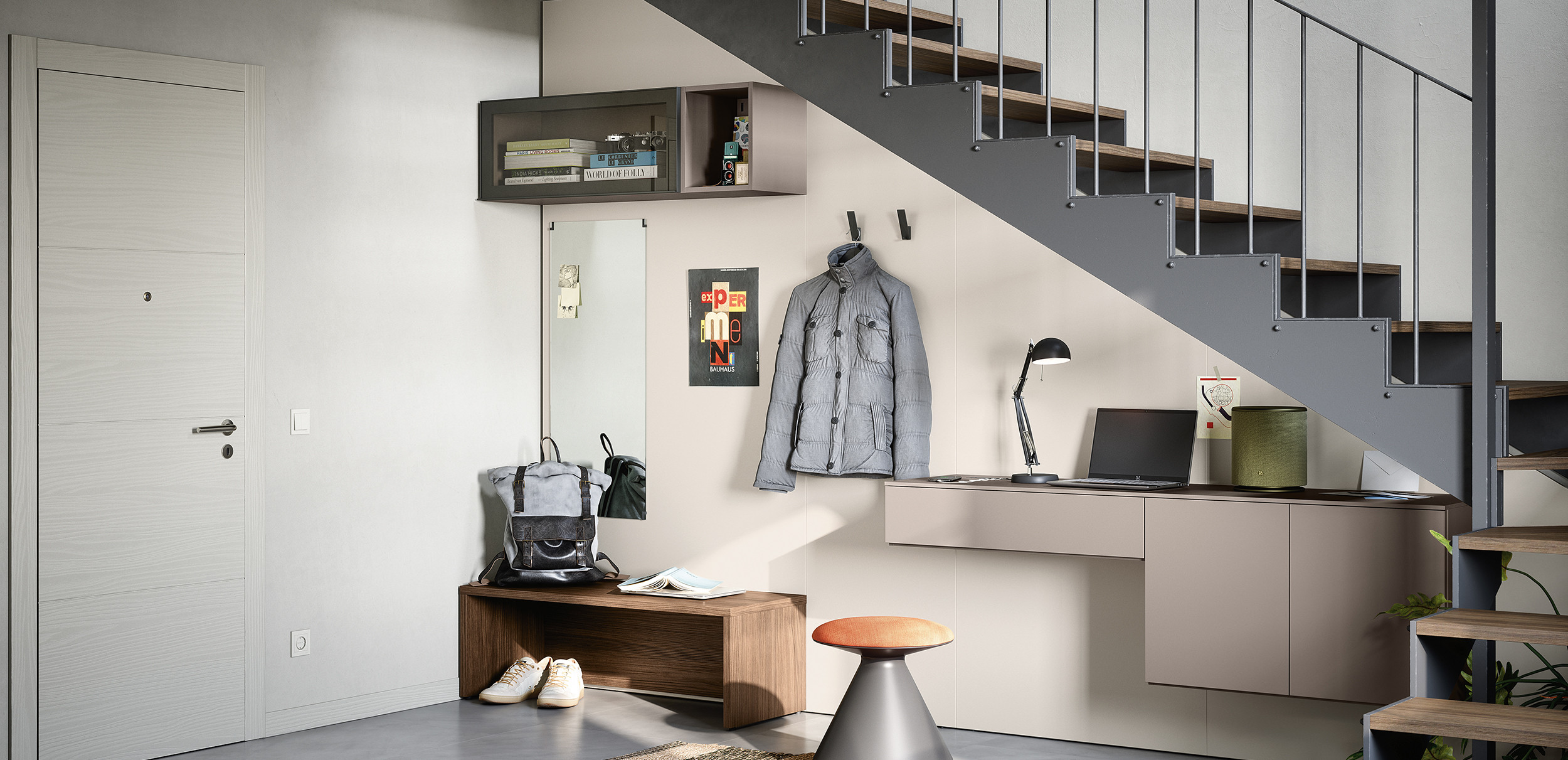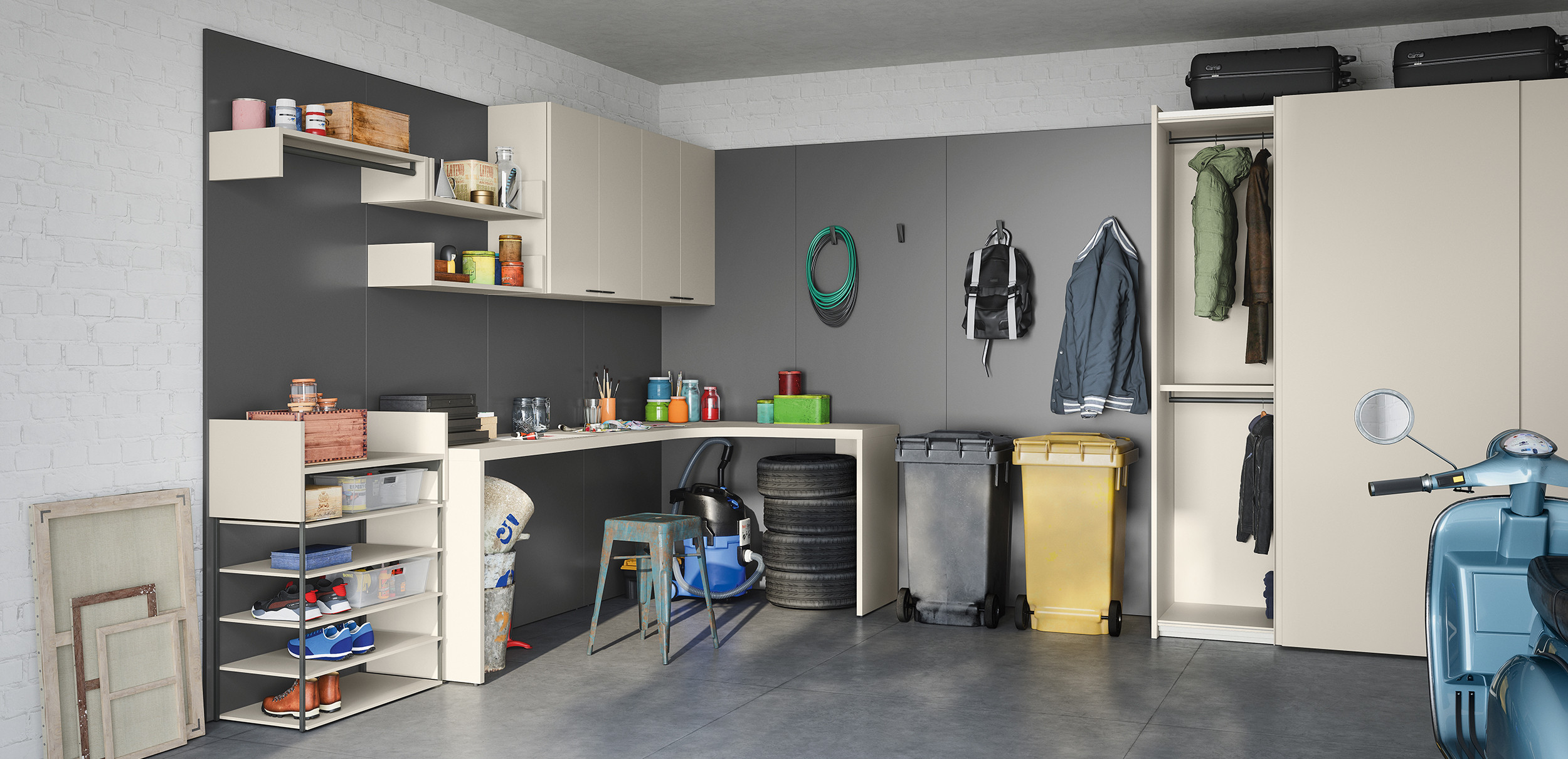 Hay varios accesorios disponibles para diseñar la composición: estantes, repisas, elementos extraíbles, muebles de colgar, bases suspendidas, percheros en barra y espejos. Las múltiples combinaciones ayudan a optimizar el espacio, haciéndolo eficiente.
