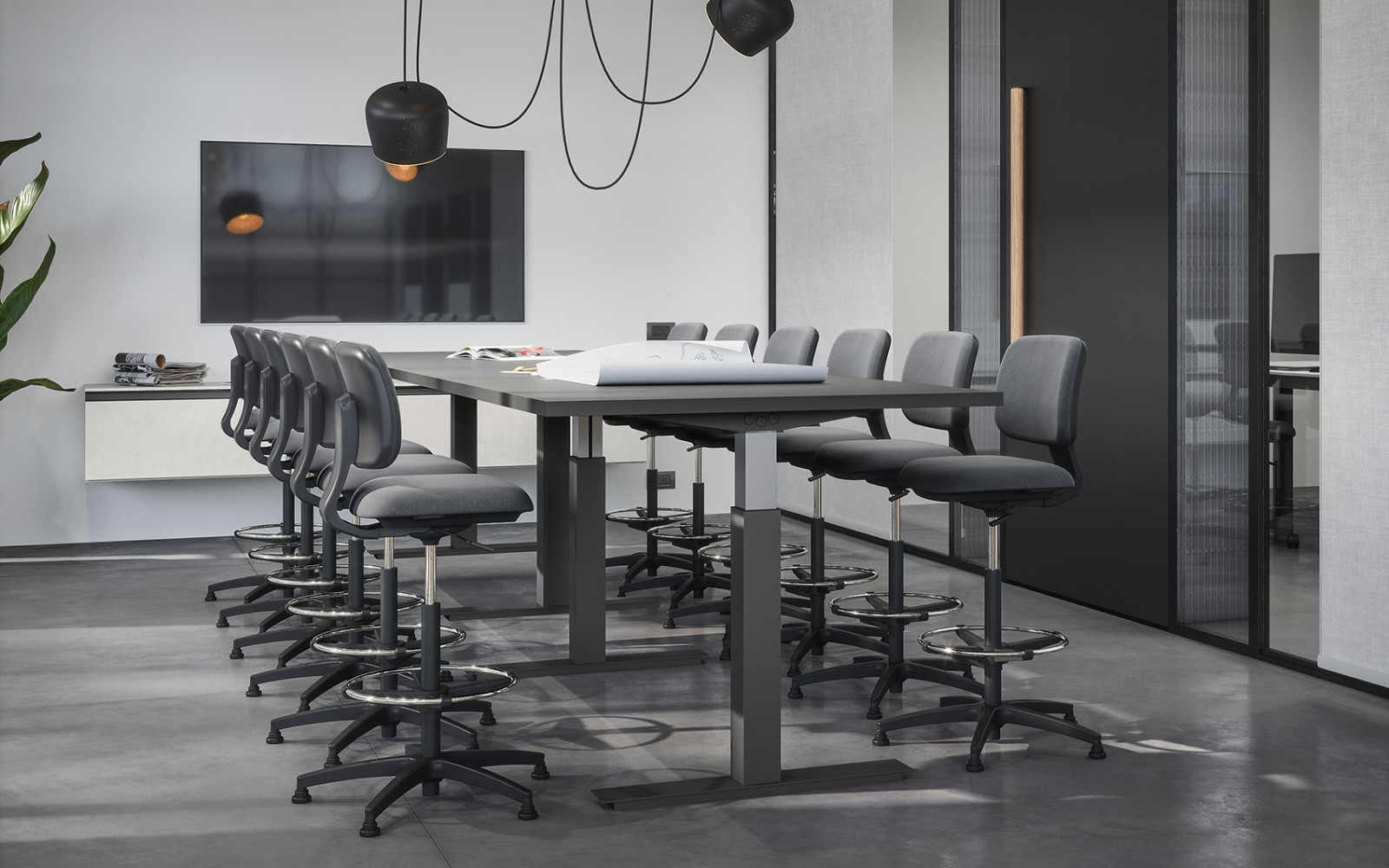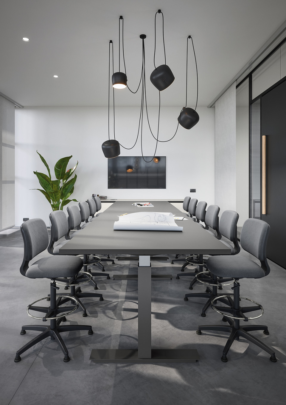 Según el tamaño y la forma de la habitación, es posible elegir la versión rectangular o circular de la superficie del escritorio, para obtener la máxima libertad de composición.