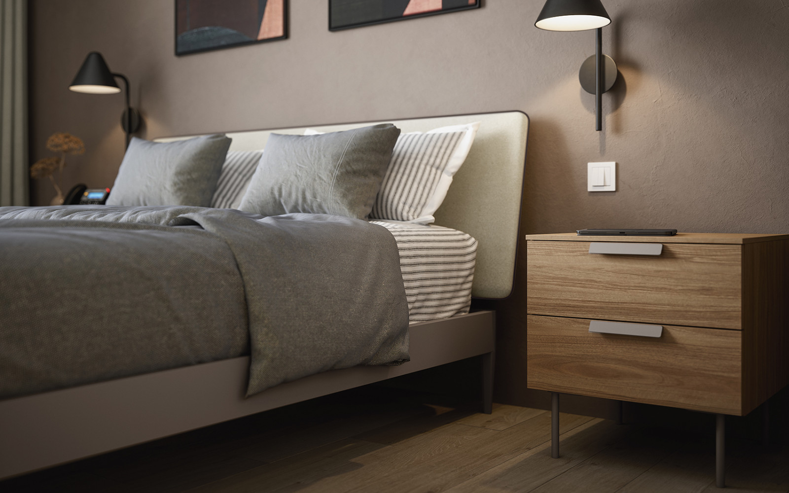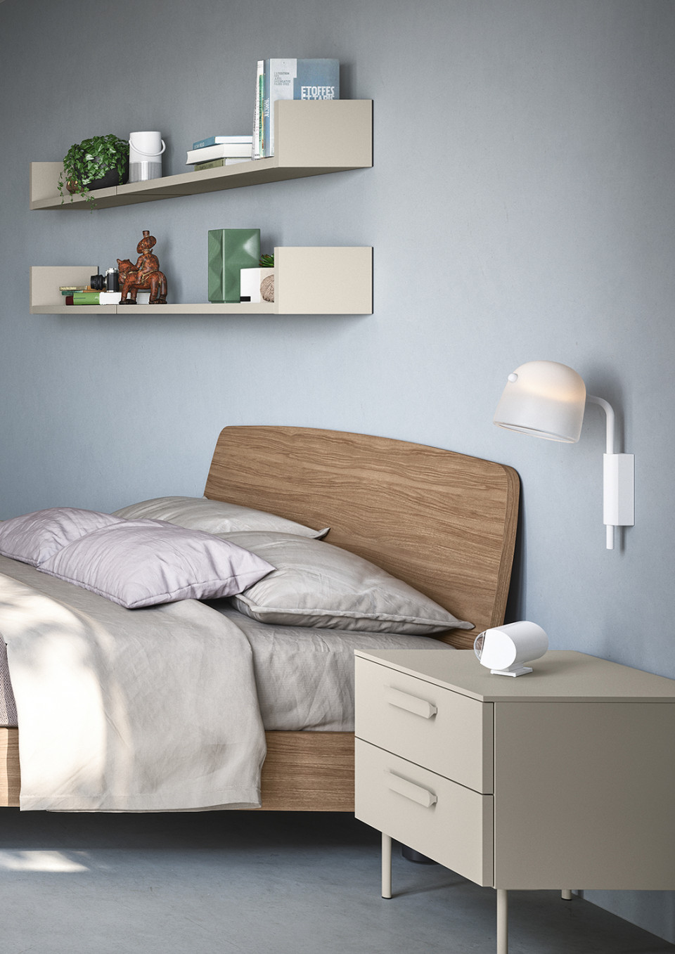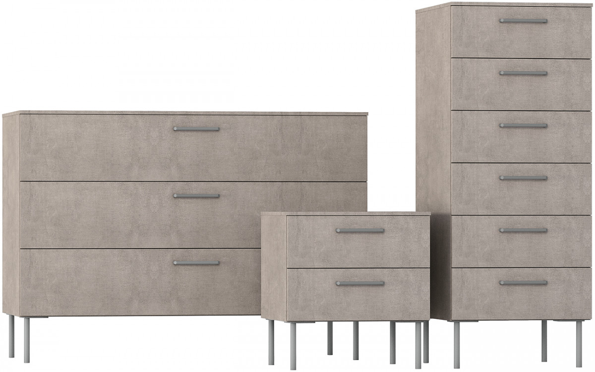 El grupo se compone de una mesita de noche, un sinfonier y una cómoda: todos los cajones de la composición están provistos de cierre amortiguado. Los colores y acabados del catálogo ayudan a acercar el proyecto a tu vida cotidiana.