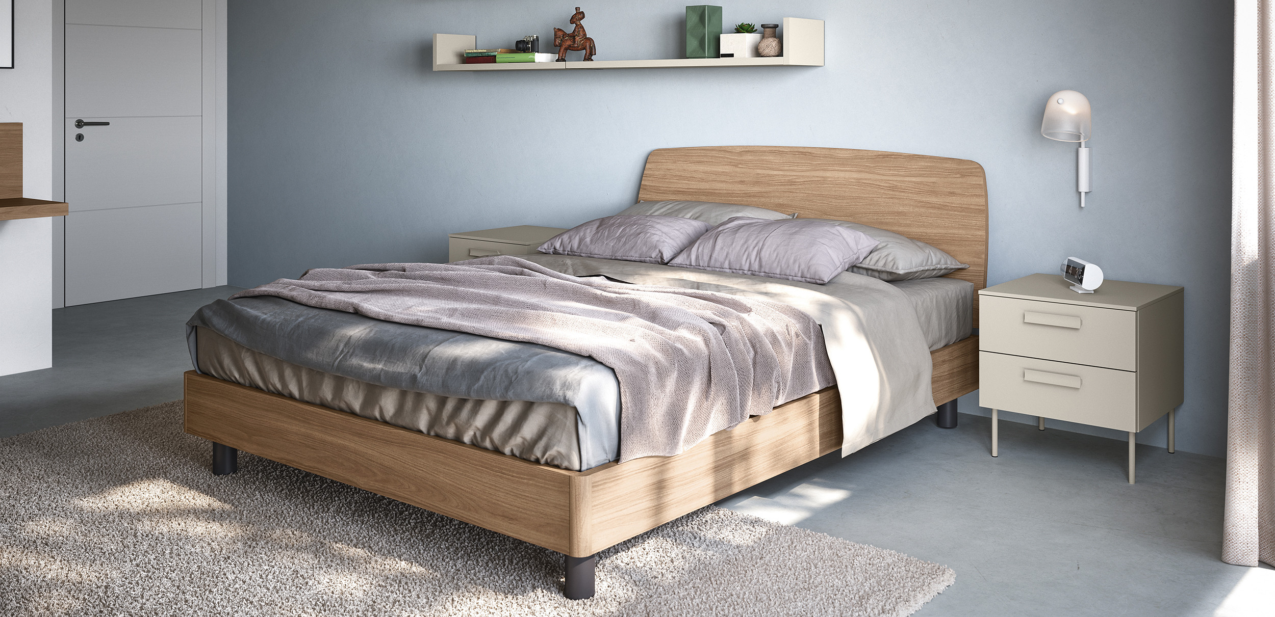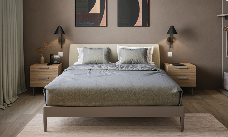 De estilo moderno y práctico, el grupo de cama Praga se distingue por las patas metálicas que sostienen la estructura. Los cajones se pueden personalizar con todos los modelos de tiradores del catálogo.