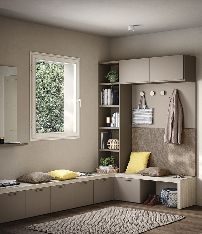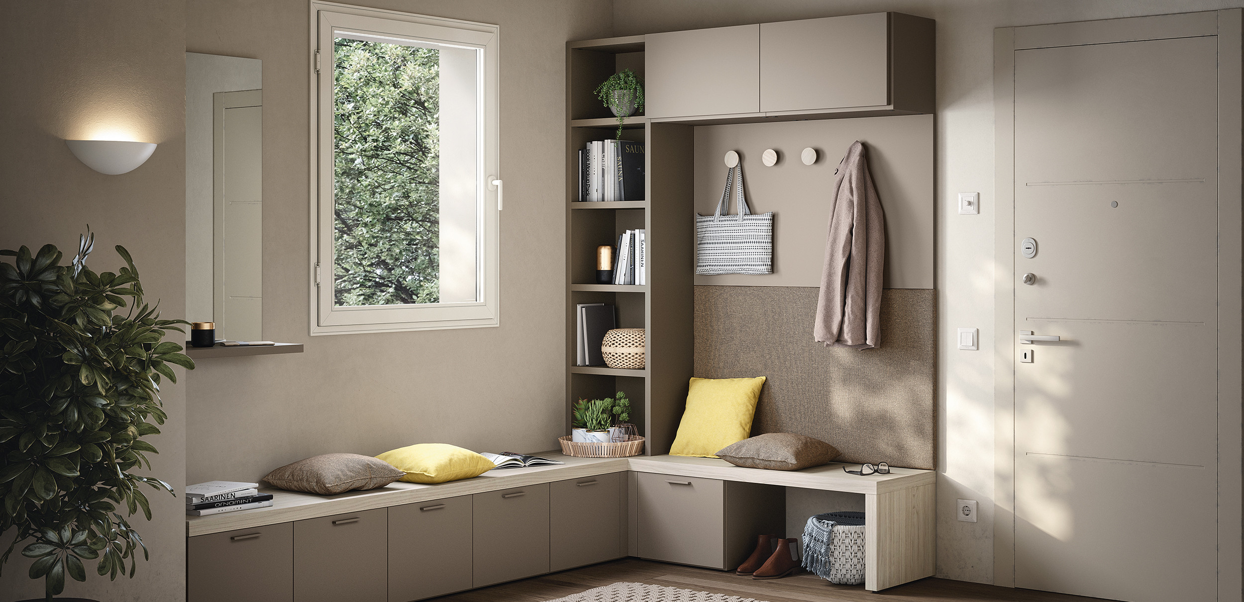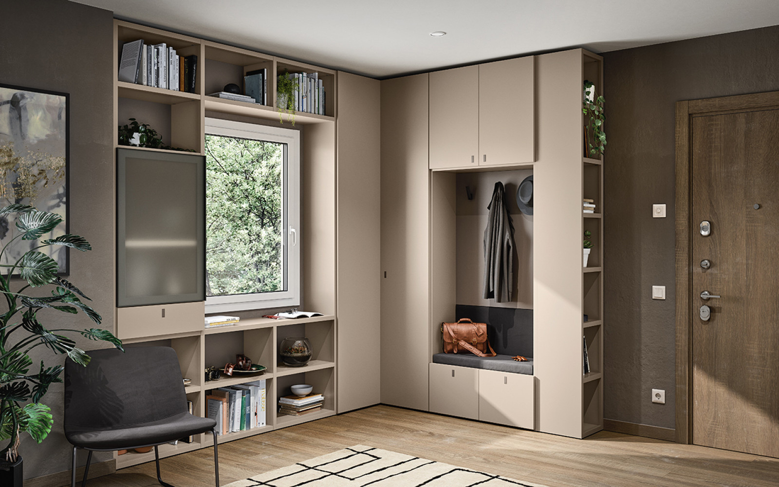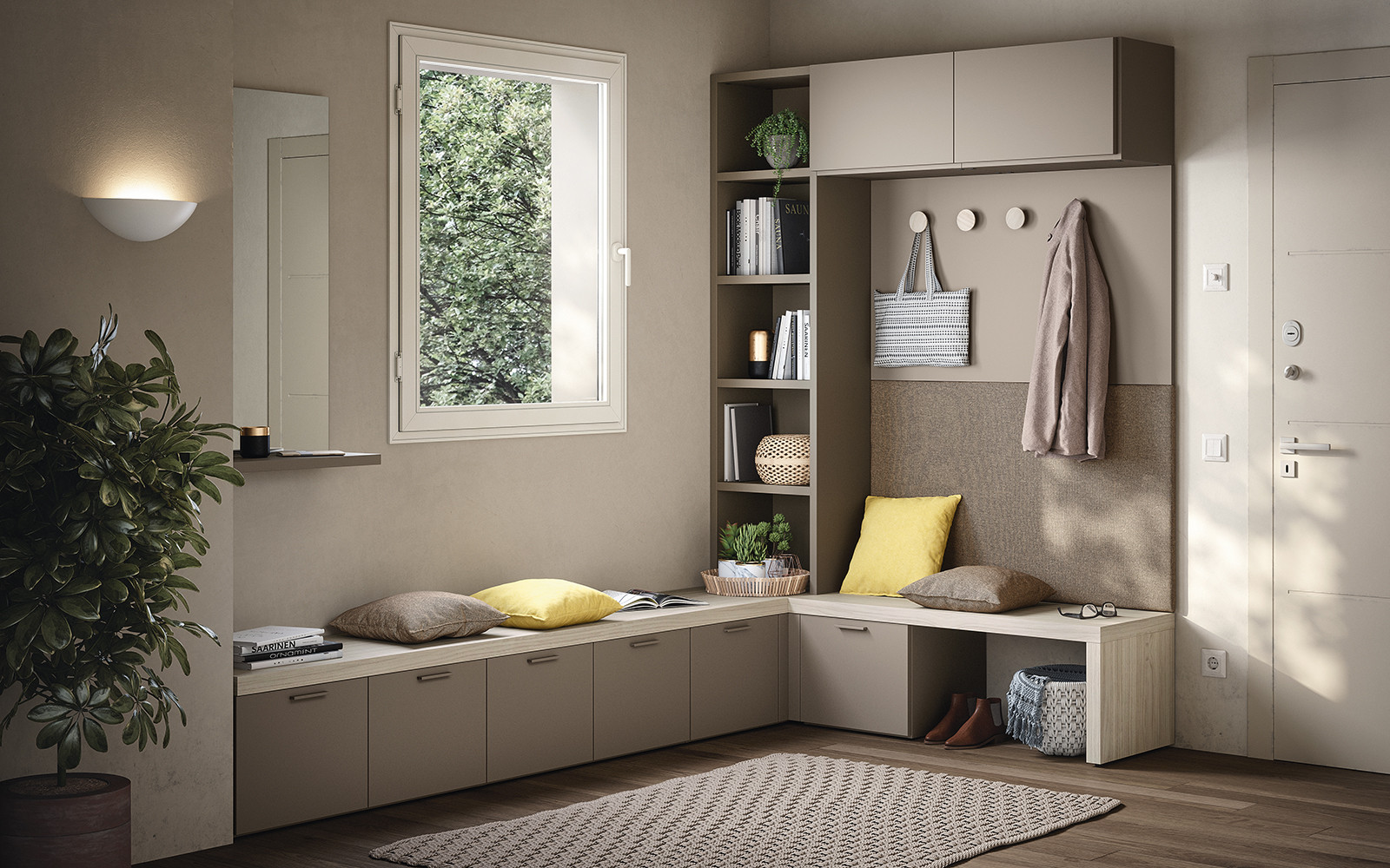 Grâce à la modularité des éléments d’ameublement, un mur avec fenêtre devient un espace structuré. L’entrée se transforme, acquiert de la personnalité et devient un espace utile et fonctionnel, mais surtout très agréable à vivre.