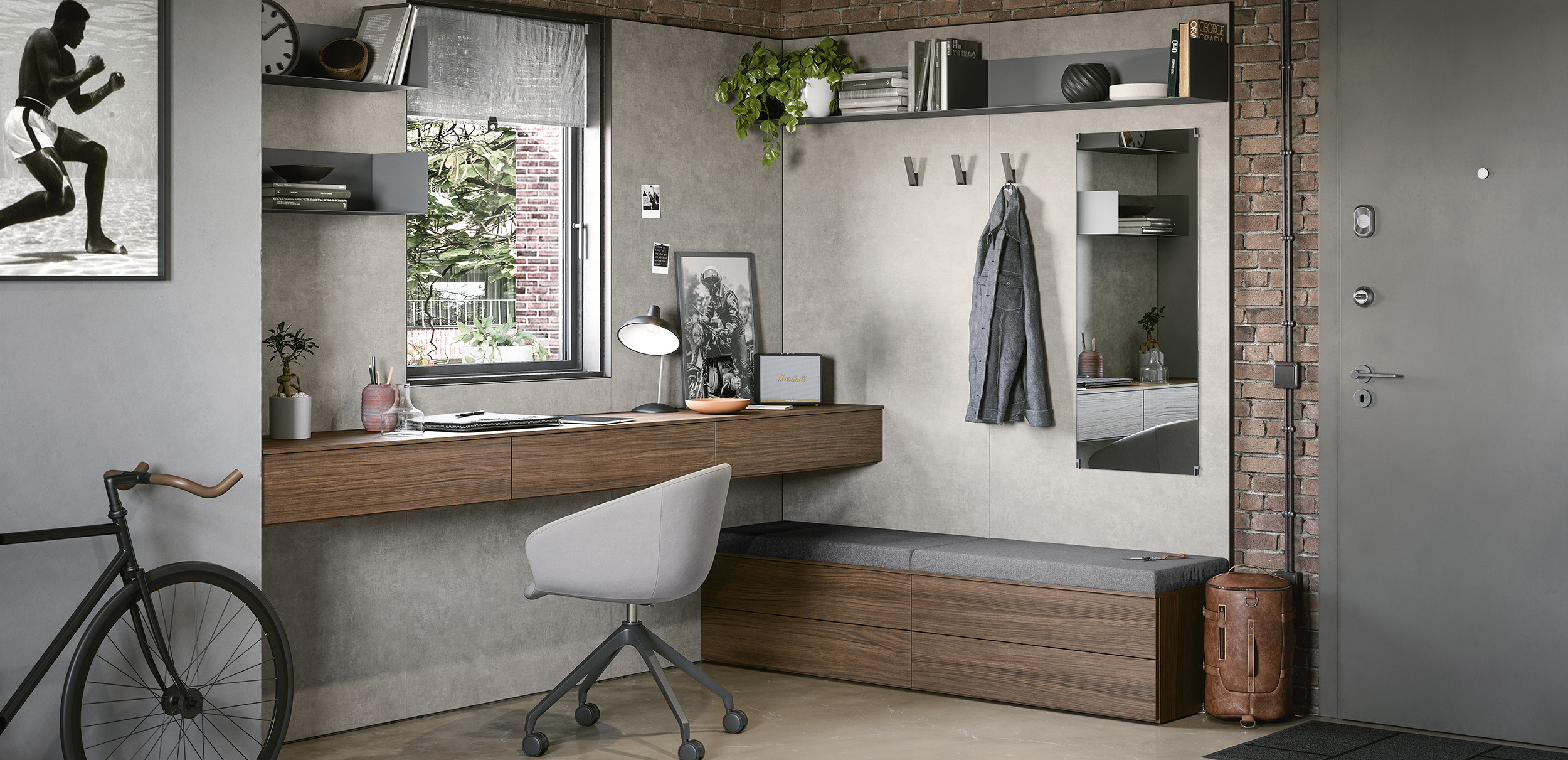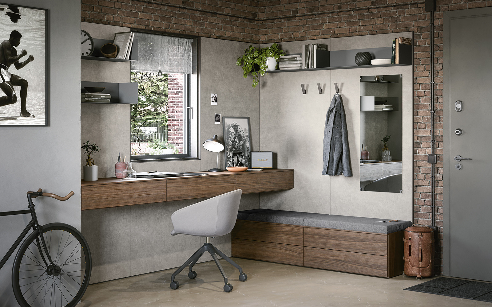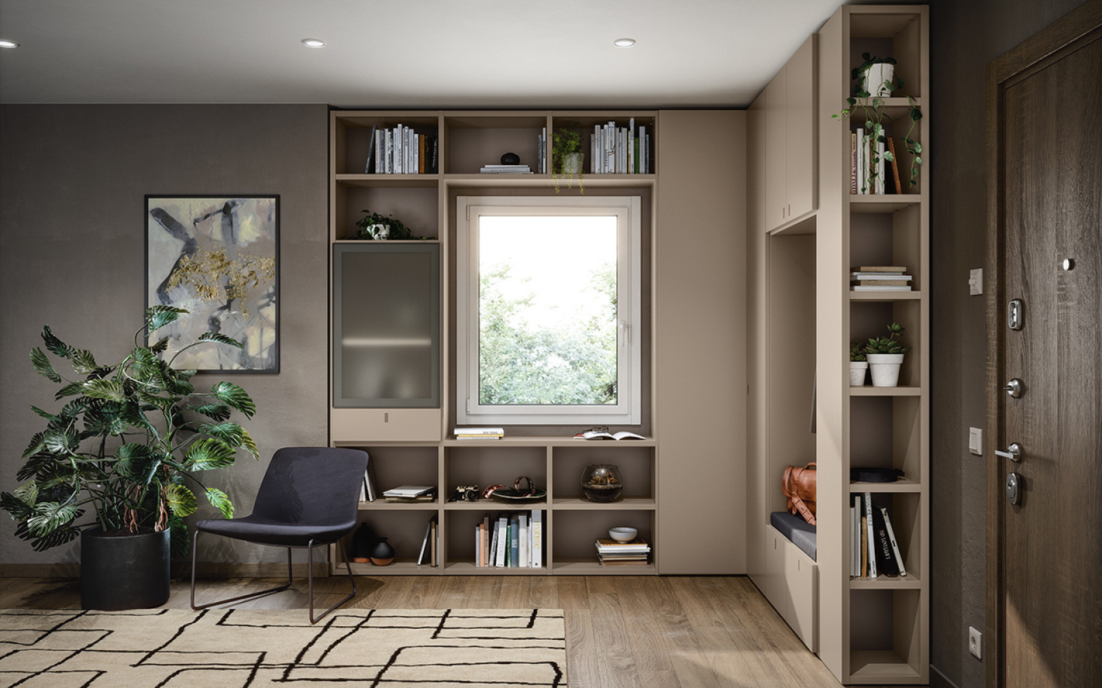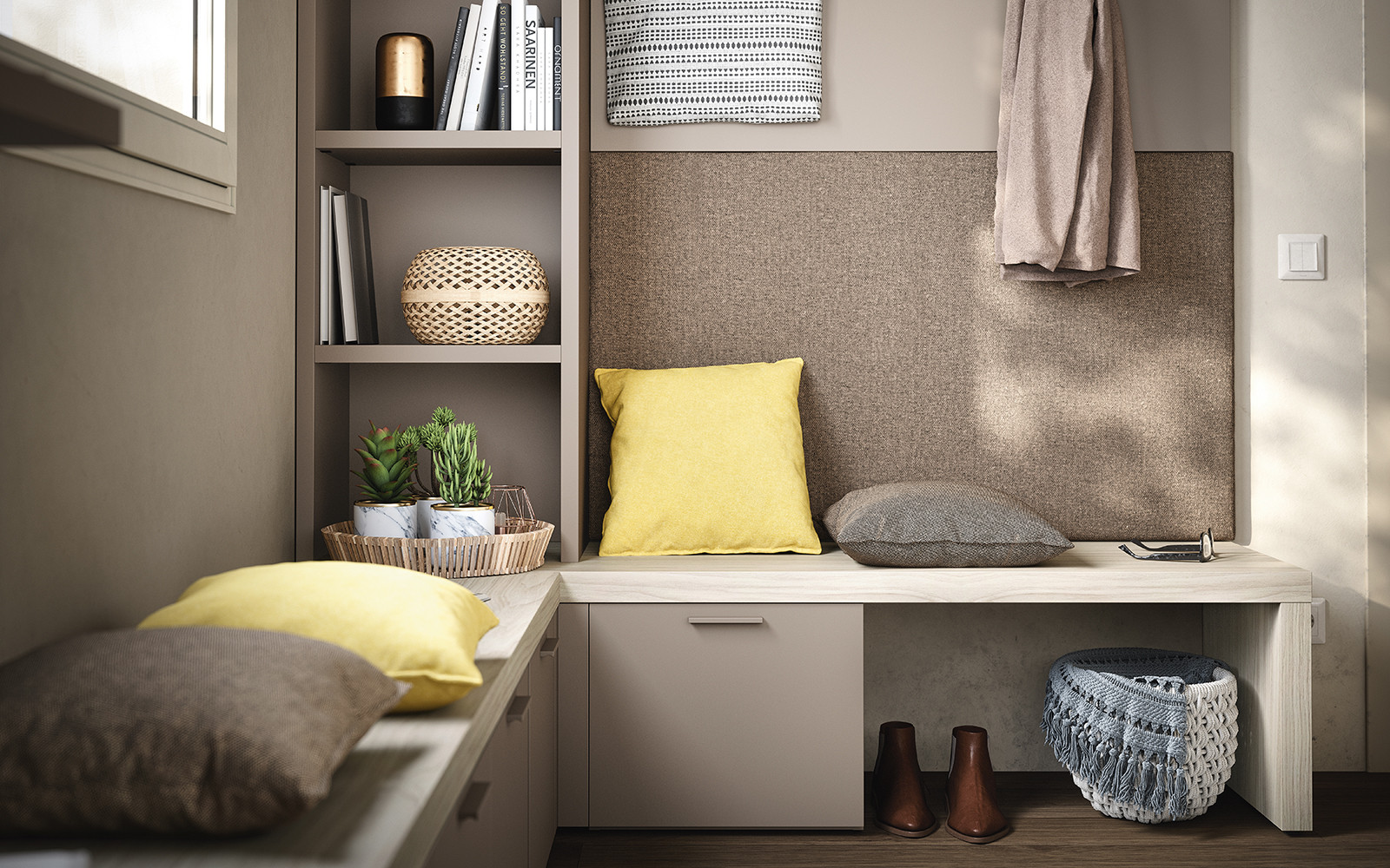 Grâce à la modularité des éléments d’ameublement, un mur avec fenêtre devient un espace structuré. L’entrée se transforme, acquiert de la personnalité et devient un espace utile et fonctionnel, mais surtout très agréable à vivre.
