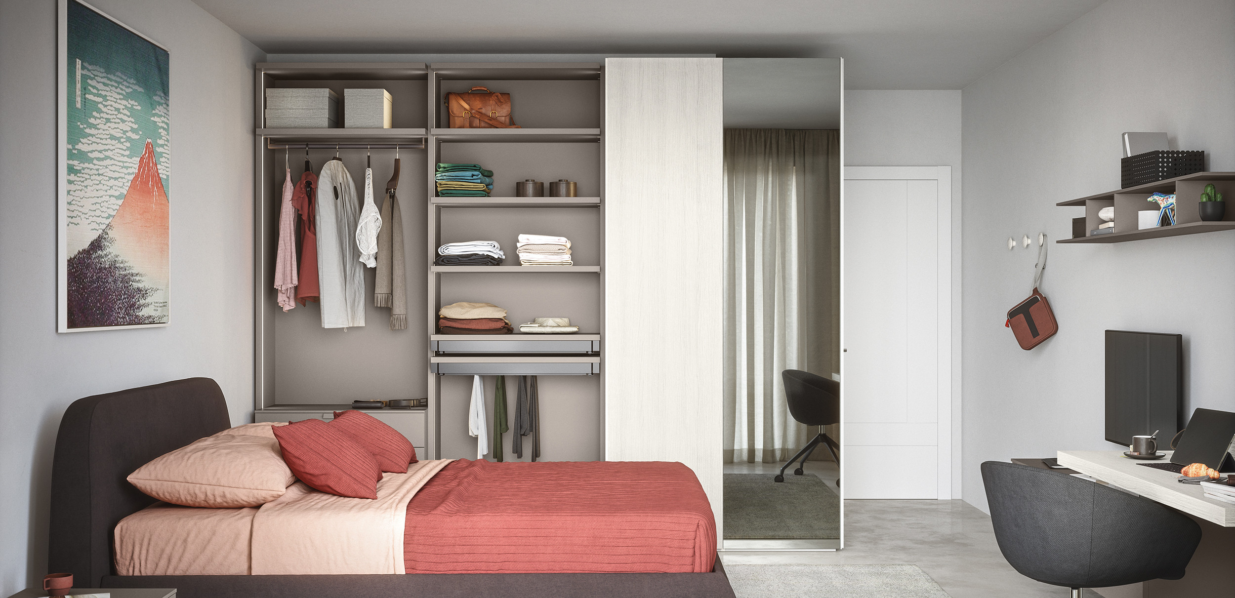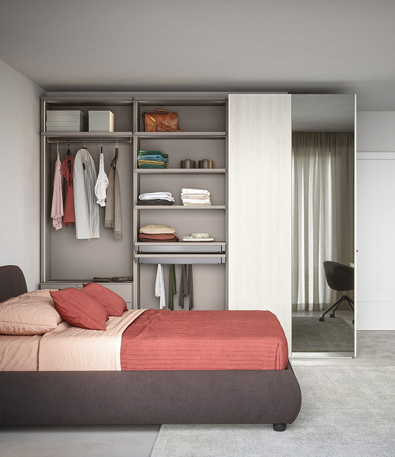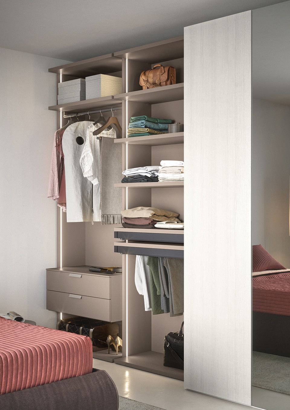 Le dressing à composer peut s’unir aux divers modules du système, en réalisant ainsi une composition fonctionnelle en mesure de meubler avec style et de fournir la bonne place aux divers objets et accessoires.
