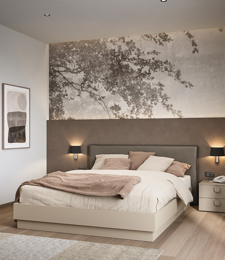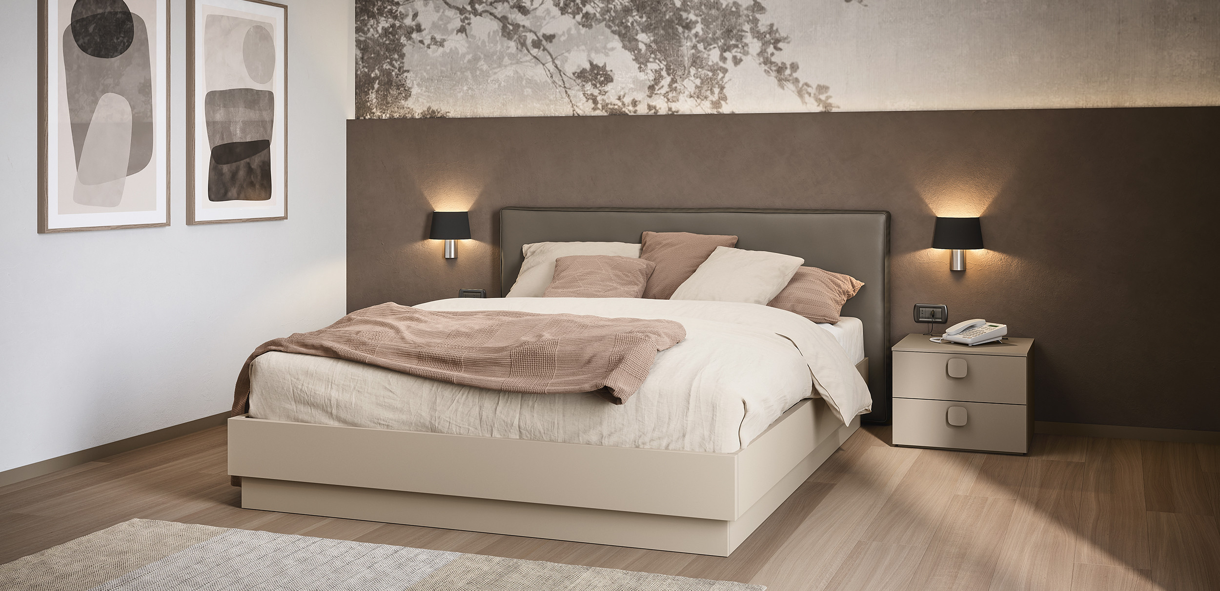 Pour apporter une touche personnelle à la chambre, on pourra choisir dans une vaste gamme de tissus ou bien la version en éco-cuir. Le lit existe également avec coffre.
