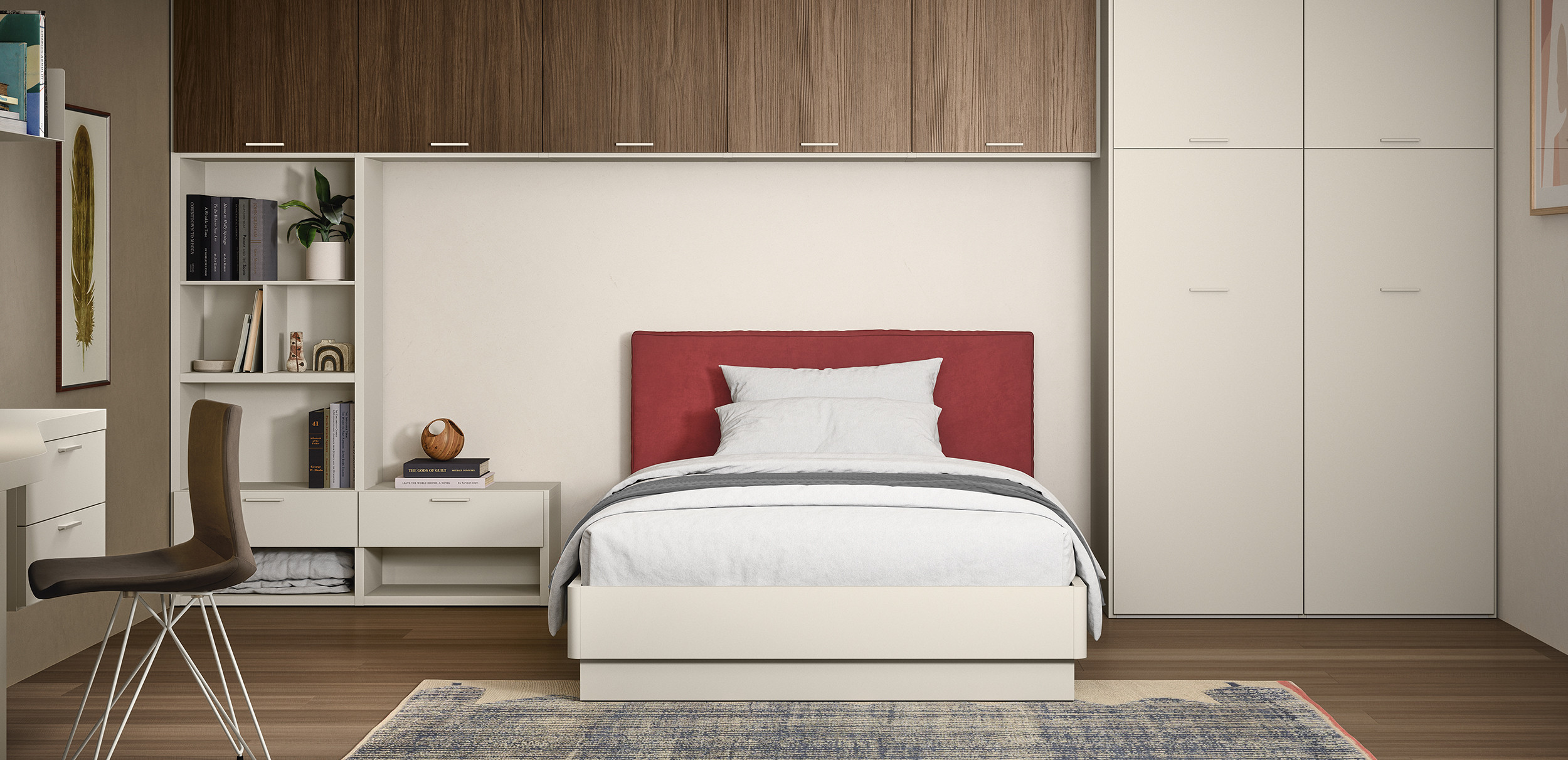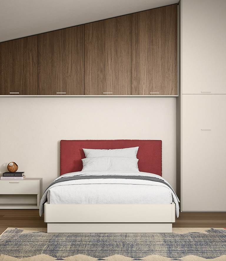 Le lit Jerez joue la vedette dans la chambre à coucher grâce à la ligne actuelle de sa tête de lit rembourrée : un élément moderne, capable de meubler de façon unique.
